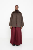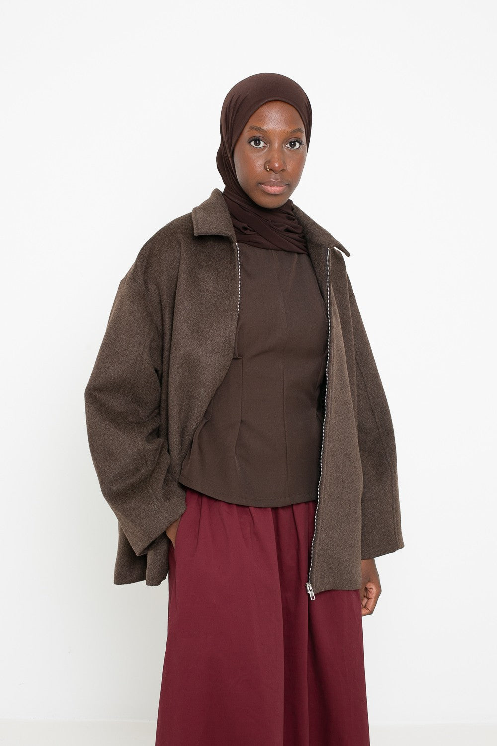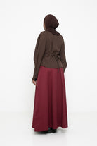 Nous avons associé cette jupe avec le top structuré brown, le hijab jersey premium dark brown et une paire de chaussures simples.
