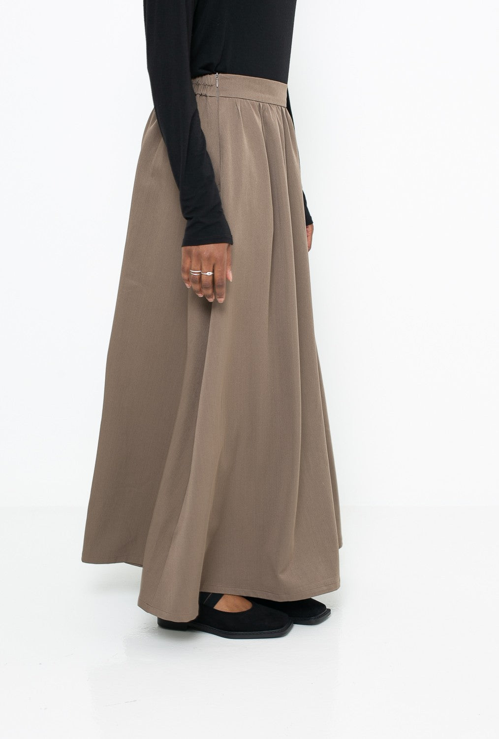 Cette jupe longue a été travaillée avec soin pour allier style et confort. Sa taille élastique uniquement à l’arrière permet une adaptation parfaite à la morphologie tout en gardant une allure chic et structurée à l’avant. De délicats plis plats sur le devant apportent originalité et modernité, créant une silhouette élégante et sophistiquée.