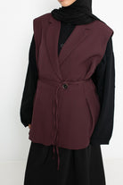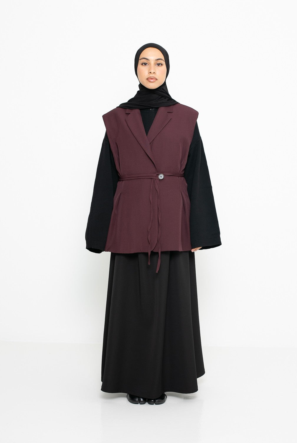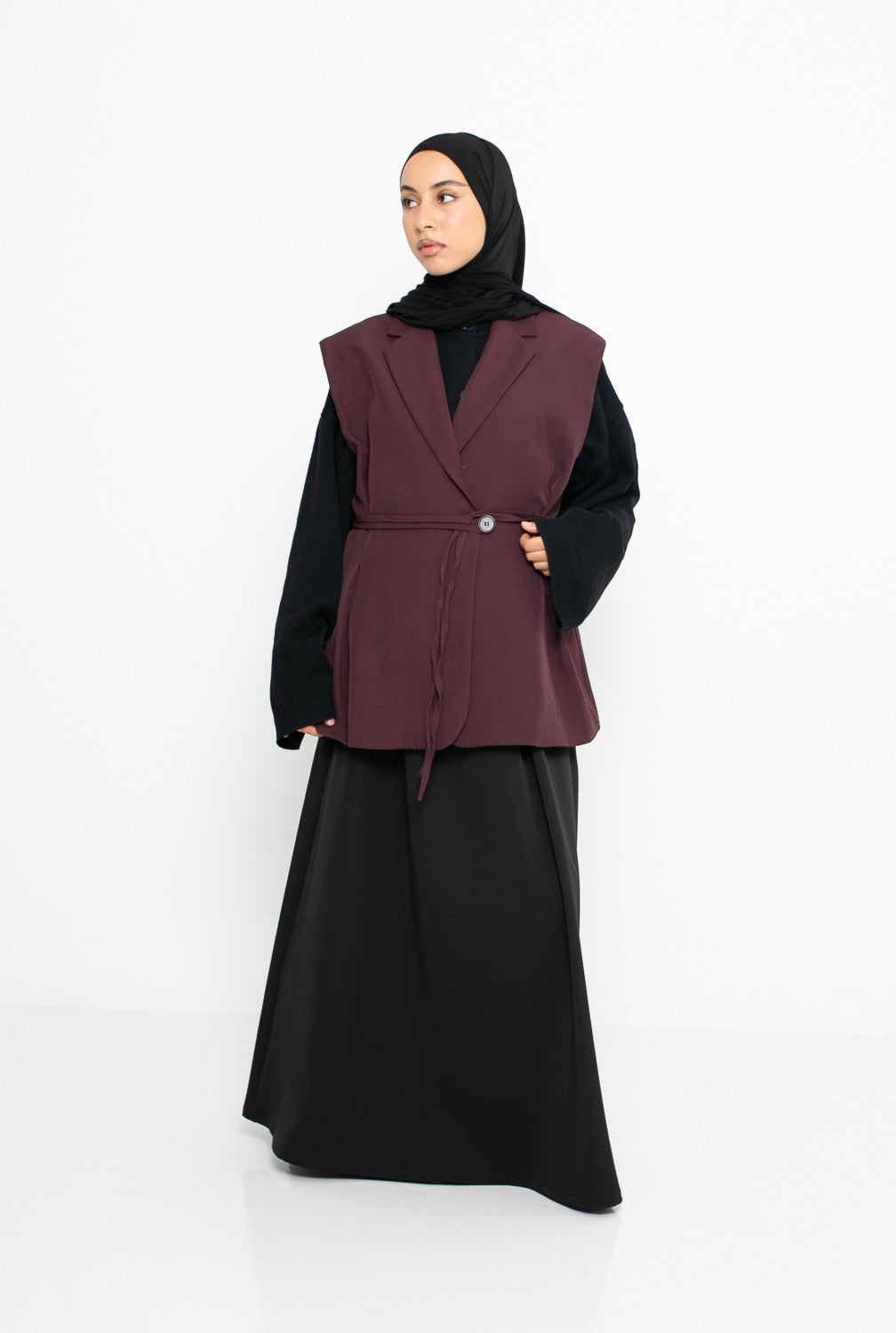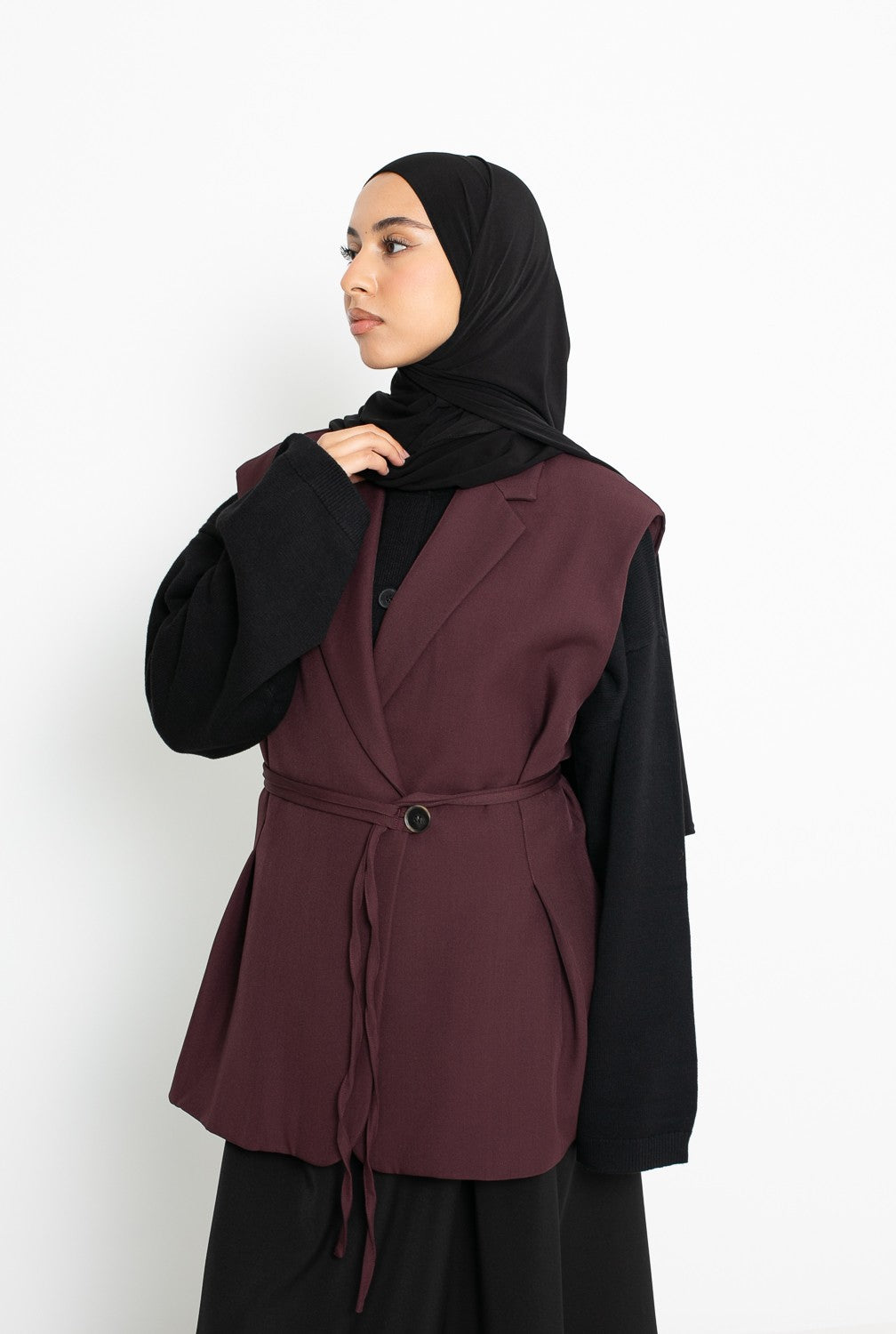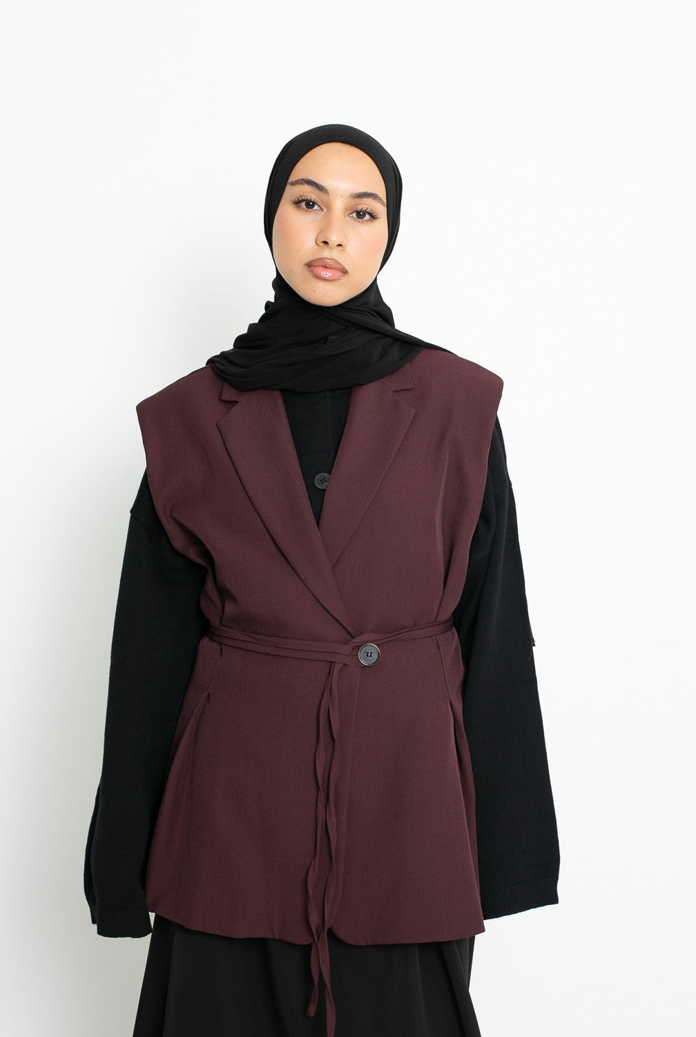 Blazer sans manches en tissu premium, entièrement doublé. Sa coupe structurée avec plis délicats à la taille et ceinture intégrée ajustable apporte une allure chic et moderne, idéal sur robe, jupe ou pantalon large. Epaulette.