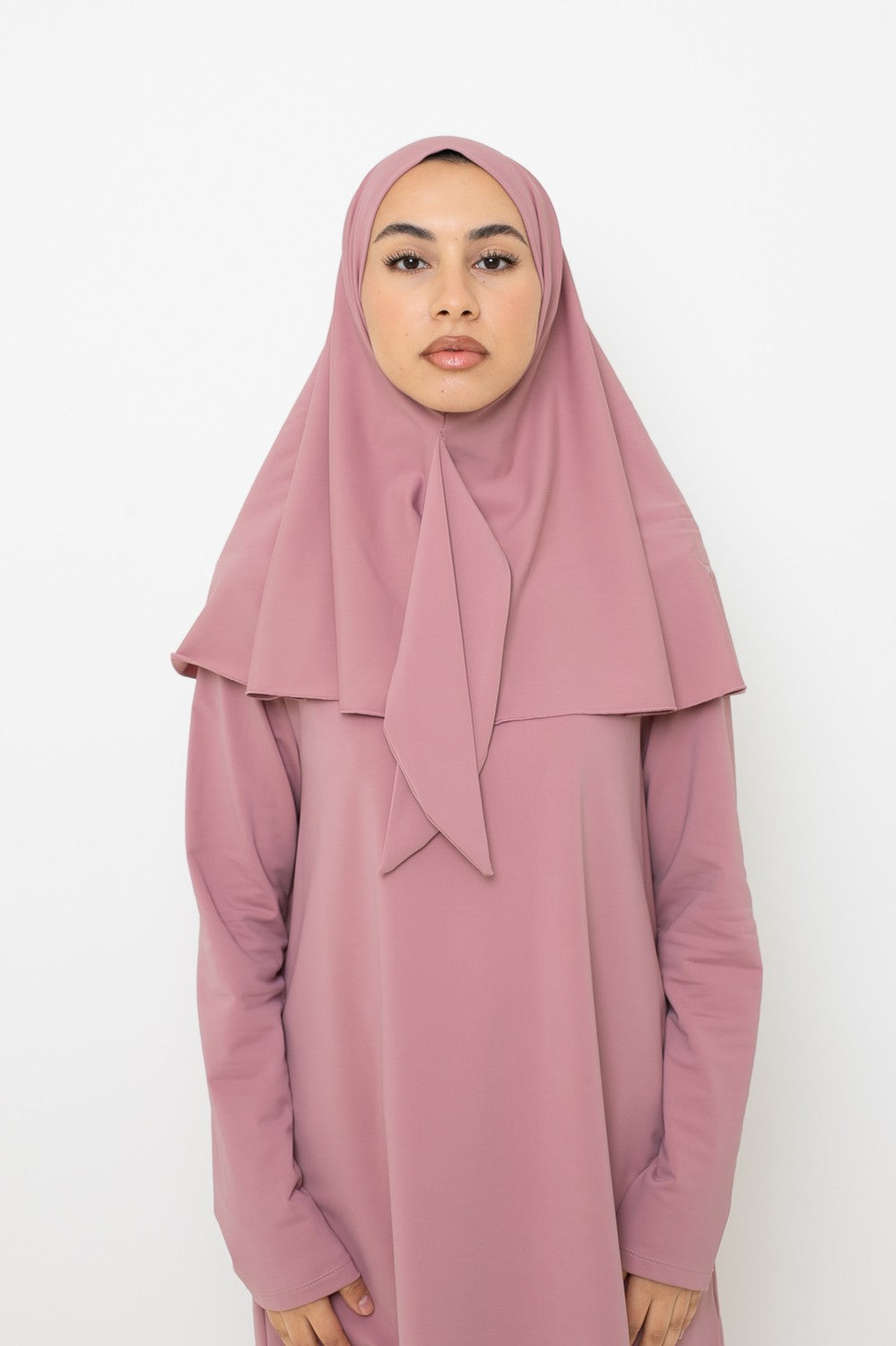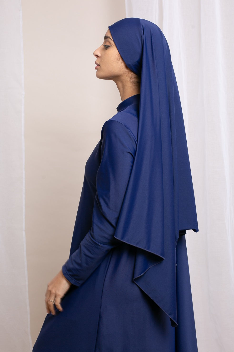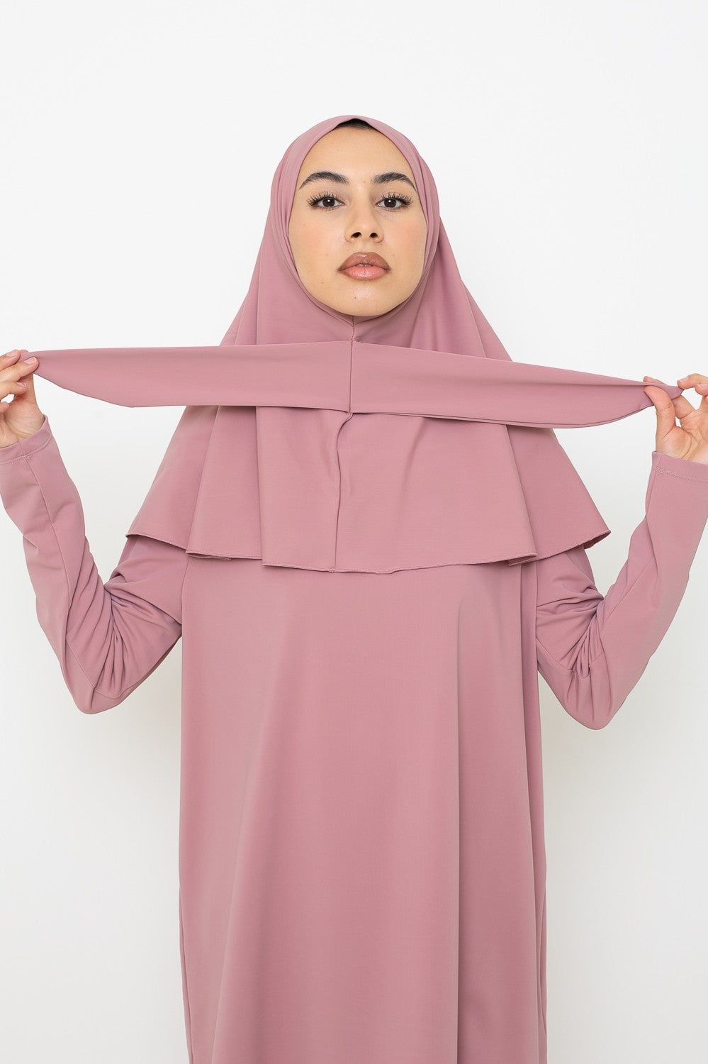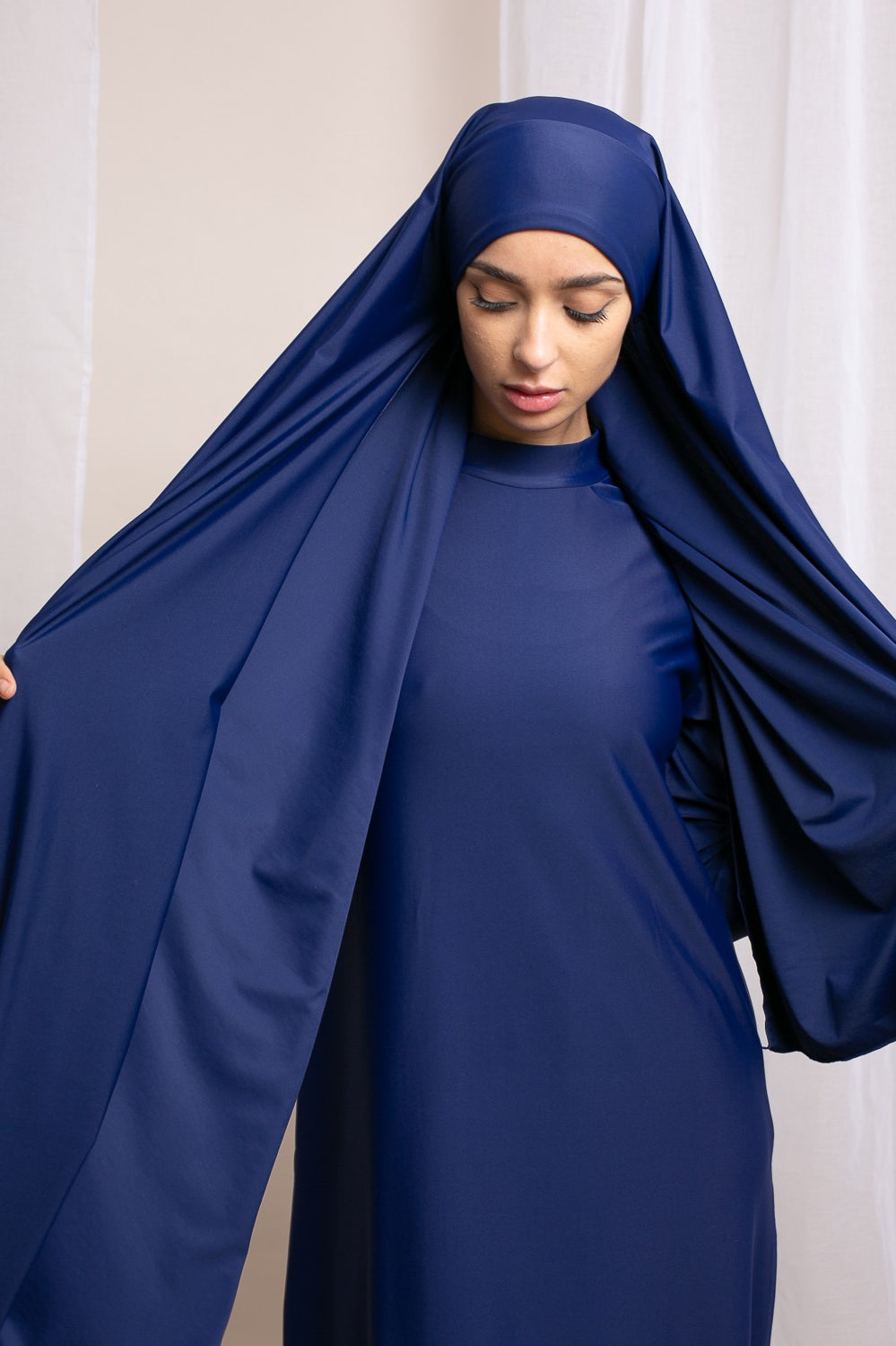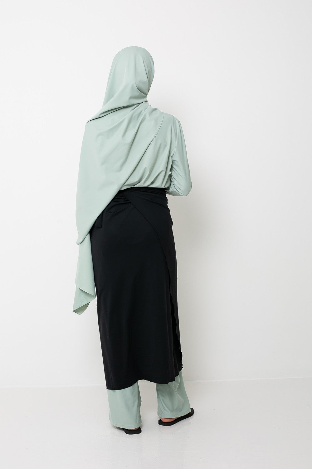 Burkini Palazzo : Un ensemble fluide et moderne, parfait pour allier élégance et confort. Composé d’un haut mi-long ample, d’un pantalon large, d’un hijab long à nouer, d’un hijab sport, d’une brassière et d’une ceinture.