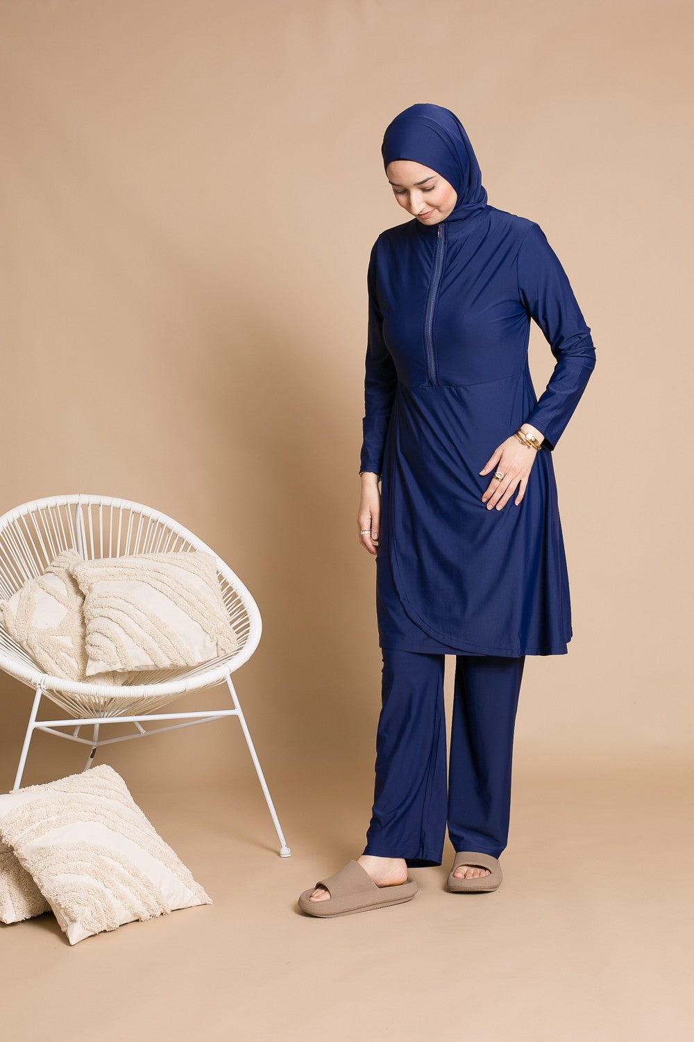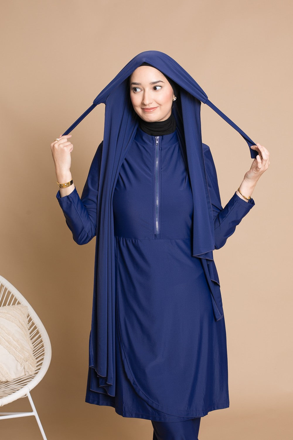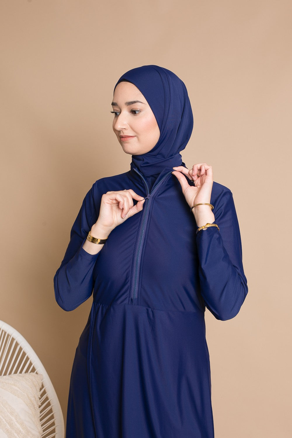 Burkini Zip : Conçu pour les femmes actives et mamans allaitantes, grâce à une tunique mi-longue avec zip. Complété par un pantalon large, un hijab long à nouer, un hijab sport, une brassière et une ceinture.
