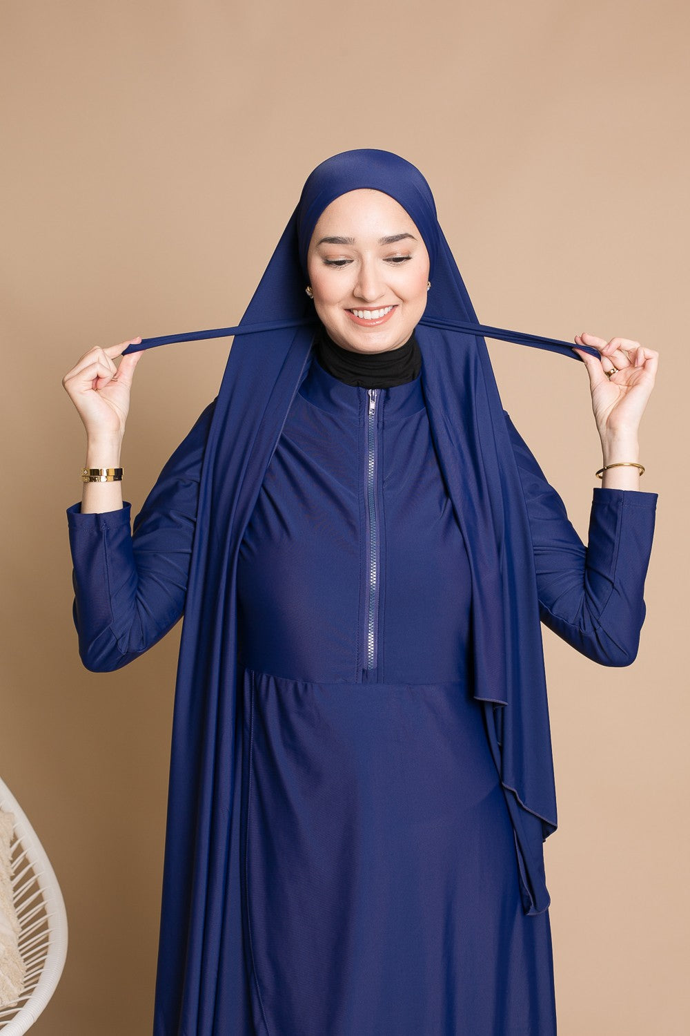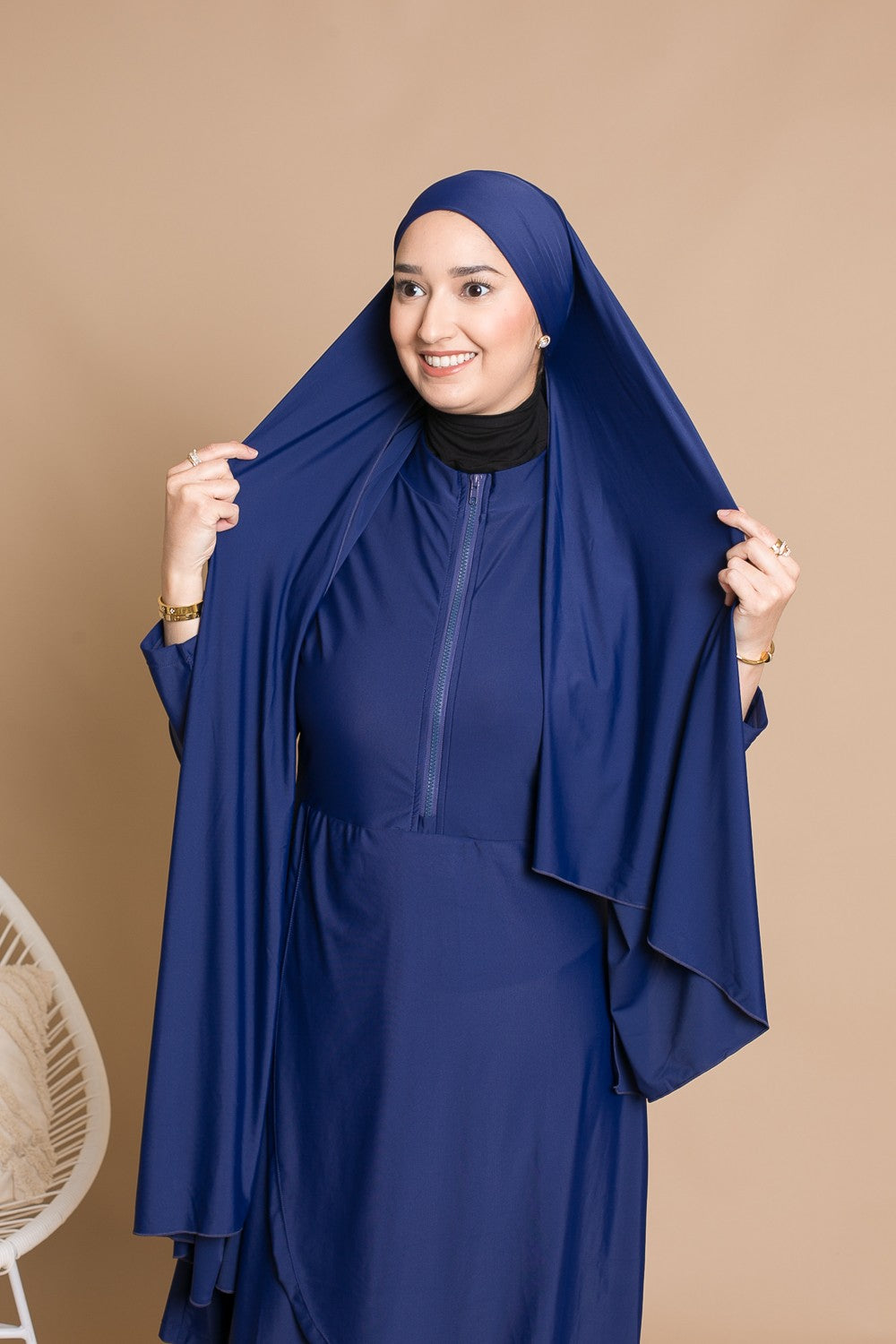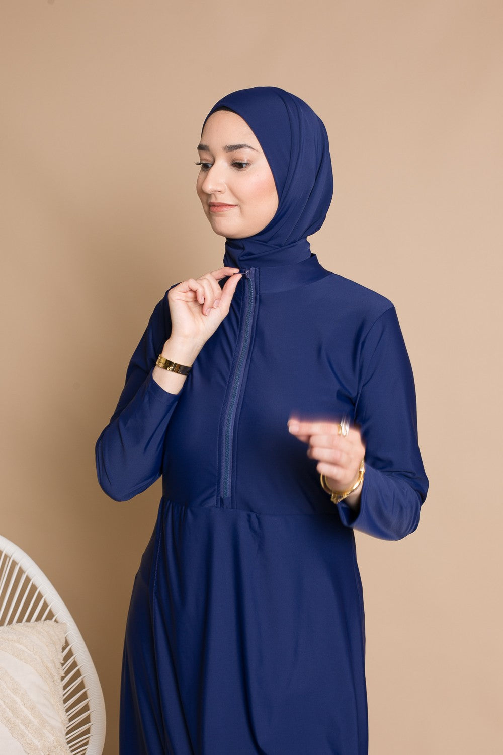 Burkini Zip : Conçu pour les femmes actives et mamans allaitantes, grâce à une tunique mi-longue avec zip. Complété par un pantalon large, un hijab long à nouer, un hijab sport, une brassière et une ceinture.