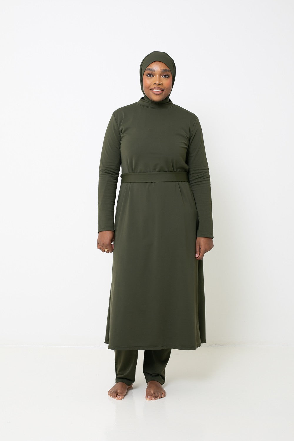 Burkini Robe : Un modèle raffiné et féminin avec une robe longue ample, un legging, un hijab long à nouer, une brassière et une ceinture.