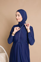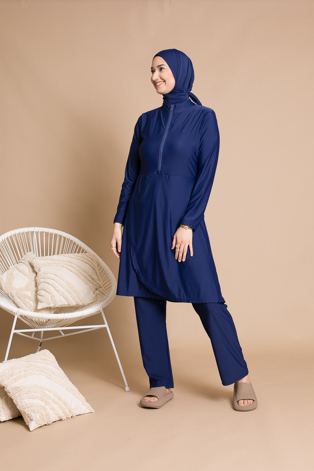 Ce modèle est moins larges que les autres, nous pensons à tous les styles. Le burkini avec zip à également fait des heureuses. Le zip avec col montant est pratique, tendance et peut être très utile pour les femmes qui allaitent. Ce burkini est composé d'une tunique mi longue avec fermeture zip et coupe portefeuille. Un pantalon de bain coupe droite et un hijab de bain.