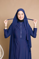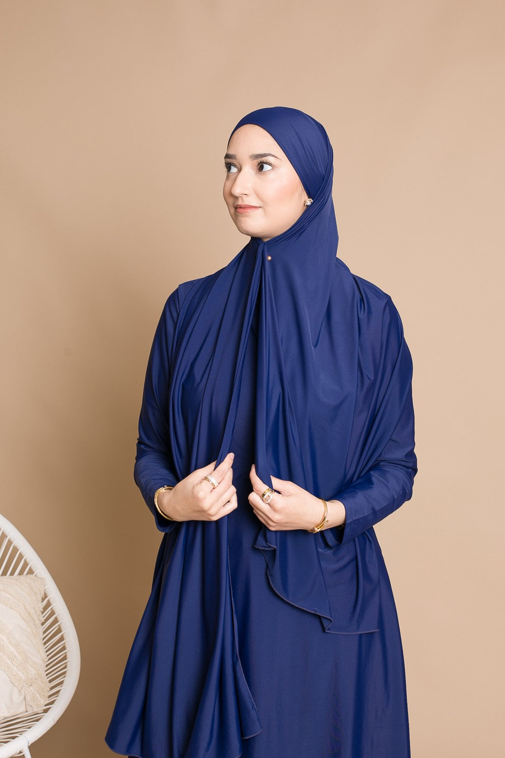 • Un hijab prêt à nouer : il s'agit du même modèle que celui que nous vendons habituellement mais en tissu burkini, le maintien est donc optimal.