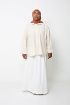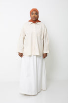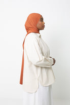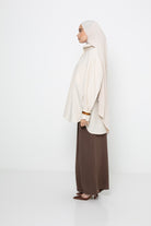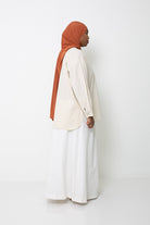 Zaharia mesure 1m71 et porte du M/L pour un bon 40 habituel. Zaharia porte la jupe lin Aouchtam blanc cassé et le hijab Jersey premium brique.