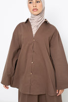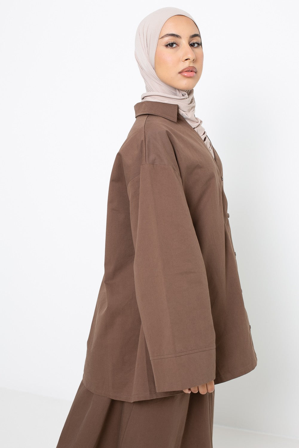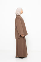 Pour un style harmonieux, nous l'avons associé à la jupe coton choco, le hijab jersey premium beige taupe et une paire de chaussure noir.