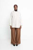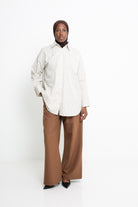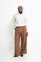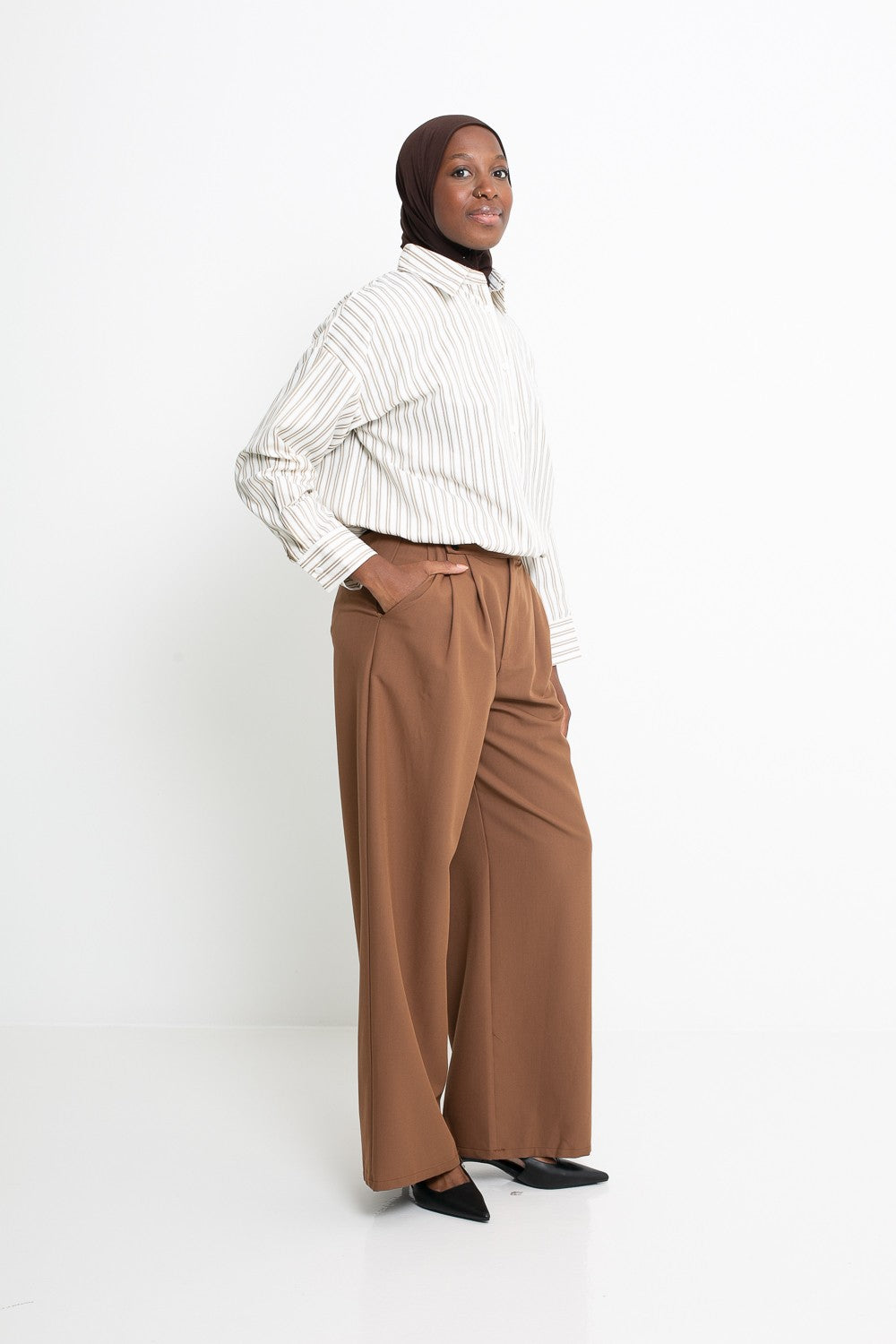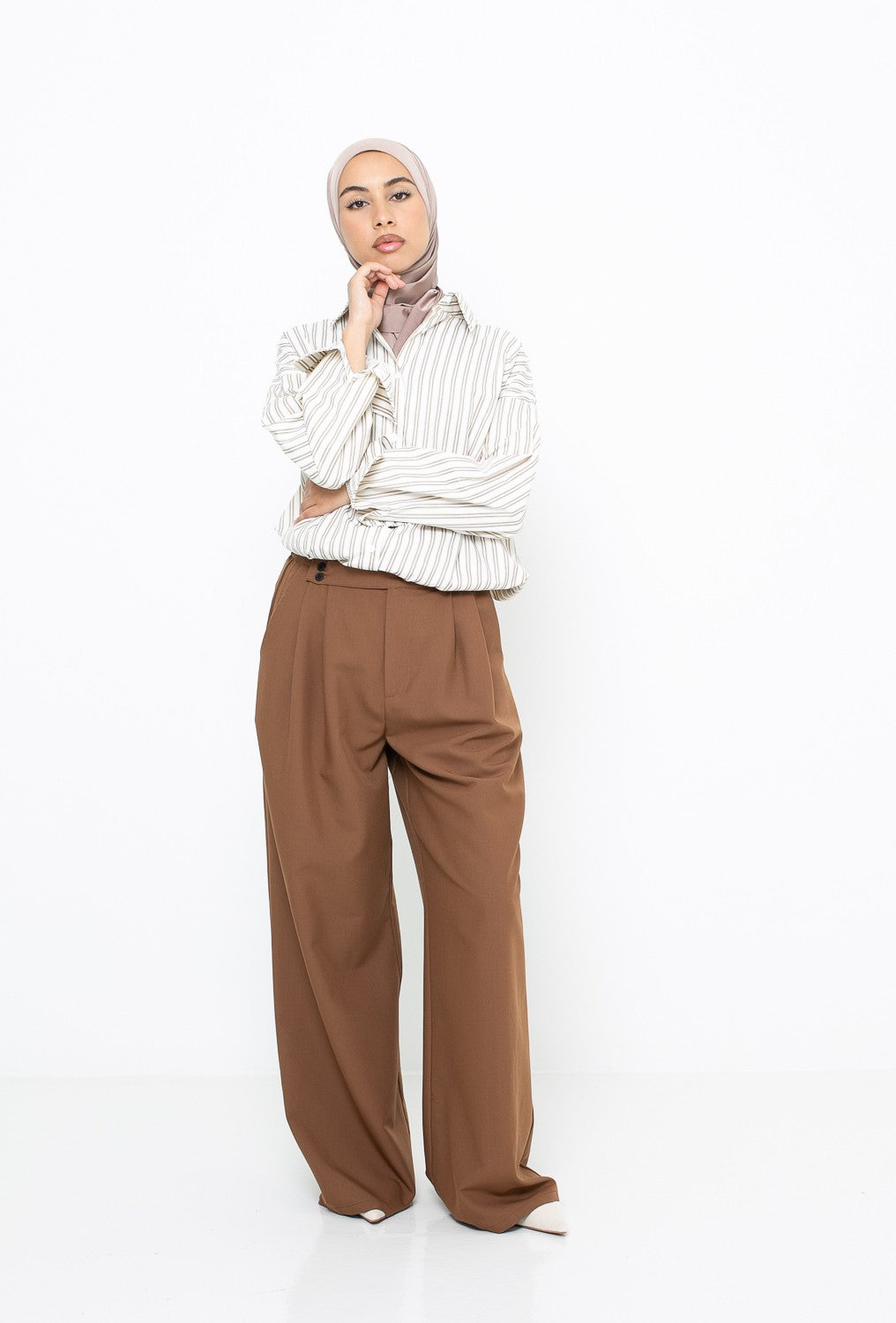 Nous l'avons associé au pantalon taille haute chatin, le hijab jersey satin taupe grey et une paire de talon natural.