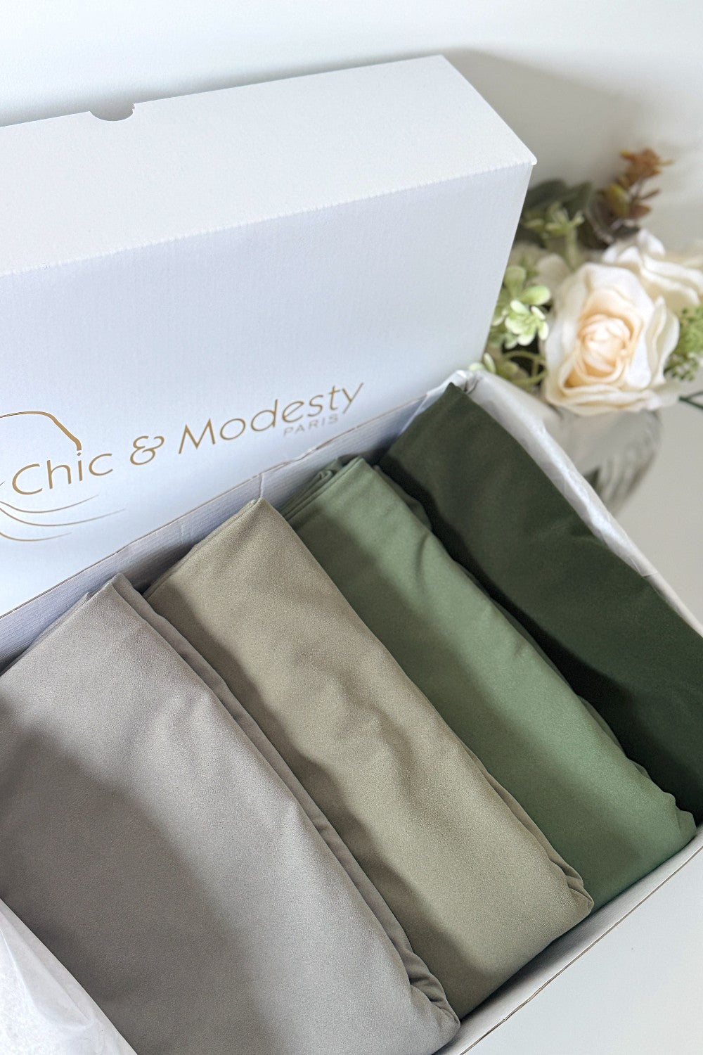 Composé de 4 hijabs premium sandy jersey. Le tout dans une belle boîte blanche et doré.