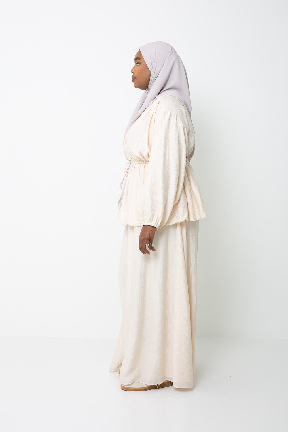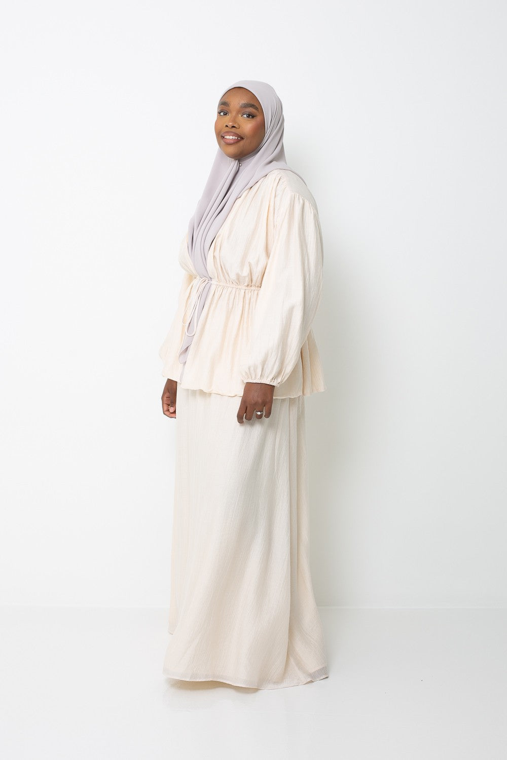 Elégant, fluide et 100% opaque, cet ensemble jupe évasée et blouse à nouer incarne la modestie moderne. Confectionné dans un tissu premium, il offre légèreté et confort pour les beaux jours, avec une coupe actuelle et des finitions soignées.