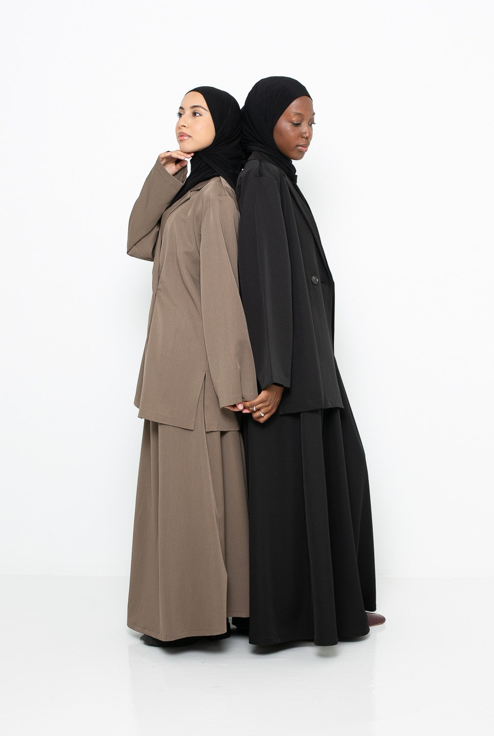 Découvrez un ensemble tailleur premium, conçu dans un tissu fluide et de très haute qualité, soigneusement sélectionné pour offrir élégance, confort et durabilité. Cet ensemble deux pièces se compose d’une veste blazer sophistiquée et d'une jupe ample et fluide, créant une silhouette chic, moderne et intemporelle.