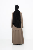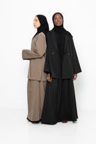 Nous l’avons porté avec le hijab noir et une paire de chaussure noir.