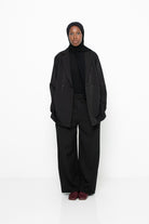 Le pantalon vient compléter la veste avec sobriété et élégance. Sa taille élastique assure confort et adaptabilité, tandis que sa coupe droite et large souligne l’allure fluide et raffinée de l’ensemble. Le tissu, choisi avec soin, offre un tombé impeccable, un confort durable et une qualité qui traverse les saisons.