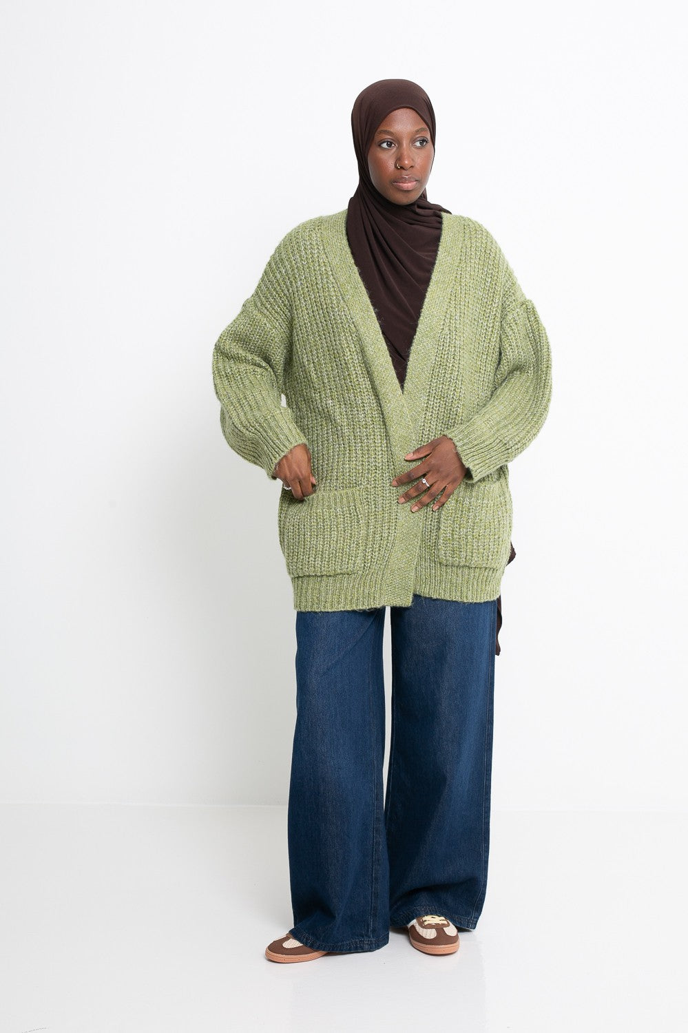 Pour un look décontracté et tendance, nous l’avons porté avec le jean loose light blue, le hijab jersey premium taupe foncé, une paire de baskets bleues pour une touche casual moderne.
