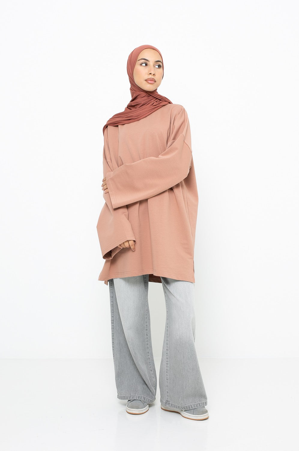 Haut ample en coton léger, doux et très agréable à porter, avec une coupe longue et couvrante idéale pour un style décontracté et modeste. Ses manches larges et son col rond apportent confort et praticité en toute simplicité. Une pièce CM de qualité, parfaite pour la mi-saison. Idéal au quotidien.