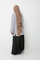 Zahra mesure 1m71 et porte du S/M pour un 40 habituel, avec une jupe bohème noir et un hijab luxe mousseline espresso.