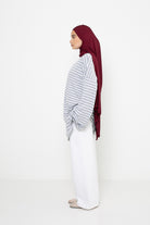Le modèle mesure 1m64 et porte du S/M pour un 36 habituel, avec un jean loose blanc et un hijab vague Jersey premium burgundy.