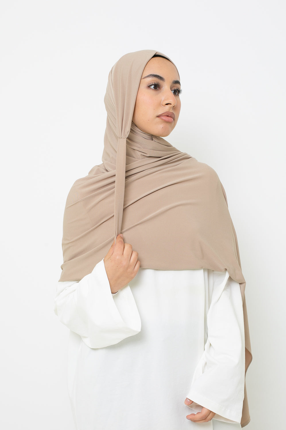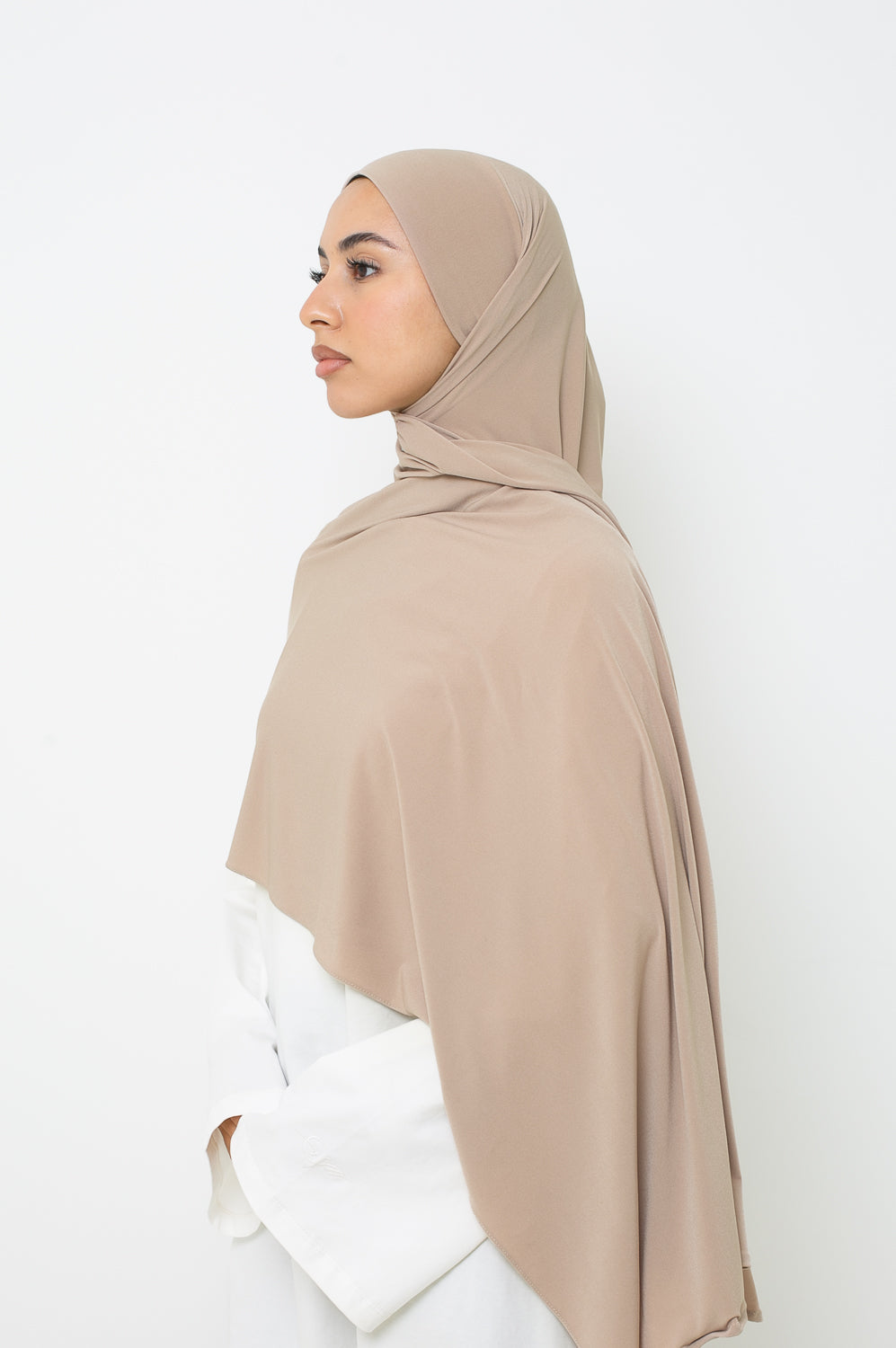 Hijab prêt à nouer en jersey premium Sandy, au design asymétrique (côté droit plus long), sans bonnet ni épingle, infroissable, opaque, doux et facile à entretenir.