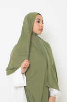 Hijab prêt à nouer en jersey premium Sandy, au design asymétrique (côté droit plus long), sans bonnet ni épingle, infroissable, opaque, doux et facile à entretenir.