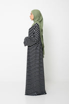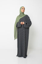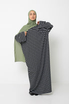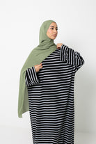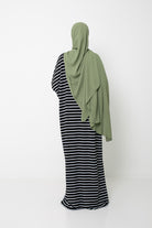 Le modèle mesure 1m64 et porte du S/M pour un 36 habituel. Nora porte le hijab luxe mousseline olive.