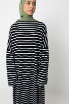 L’intemporelle marinière s’invite dans votre garde-robe sous forme de robe longue fluide et oversize, pensée pour allier confort absolu et style effortless. Avec son col bateau subtilement dégagé et ses manches à revers cousus, elle emprunte les codes marins tout en restant féminine, douce et moderne.