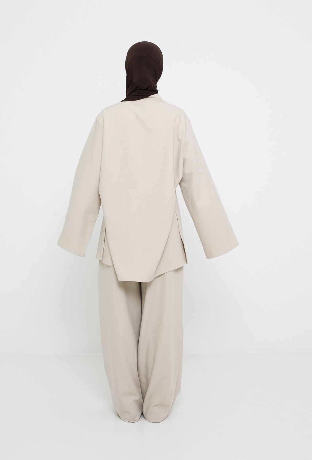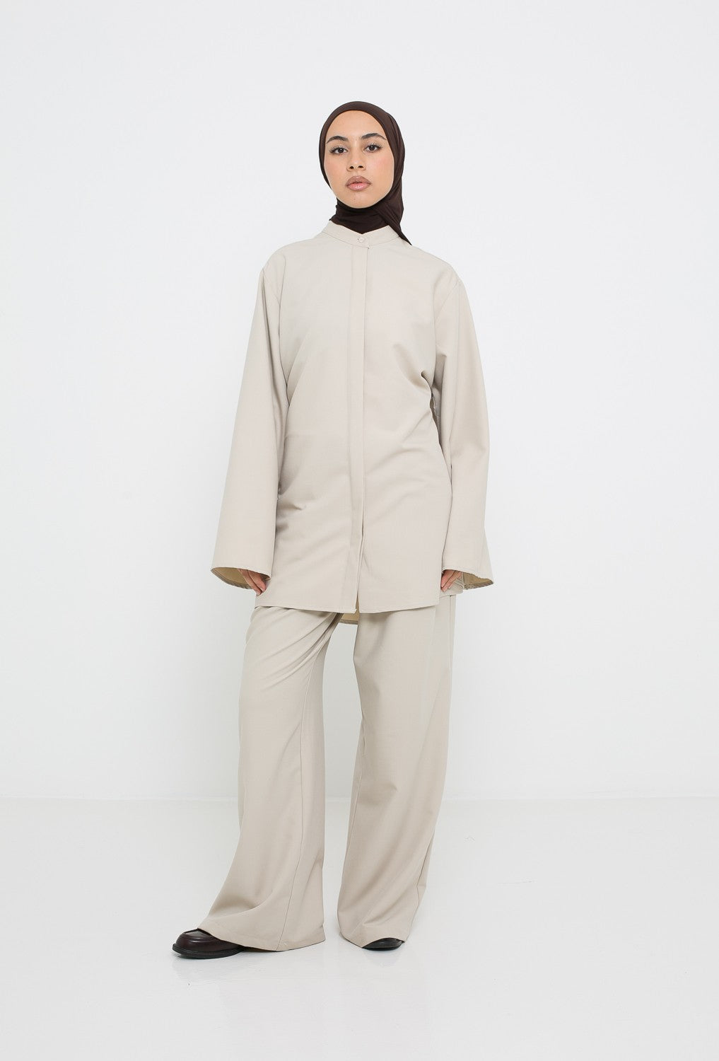 La Chemise longue Fall est une chemise longue fluide à col mao et boutons invisibles, à porter de trois façons grâce à ses liens latéraux ajustables. Avec sa coupe ample, ses manches larges et ses fentes latérales, elle allie élégance et confort dans un style moderne et minimaliste.