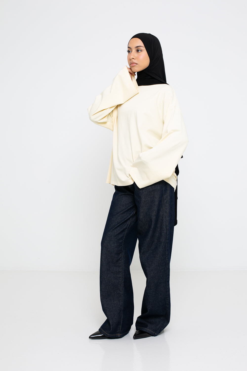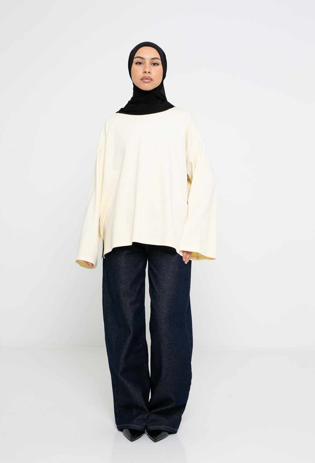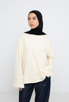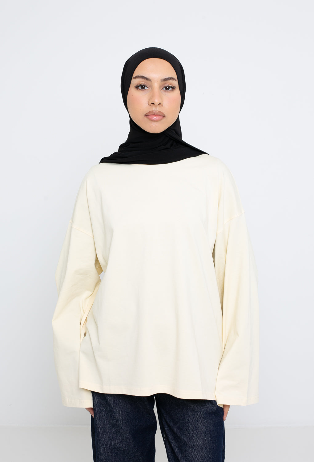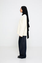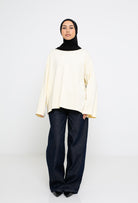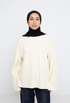 Coupe oversize, manches longues larges, fentes sur le côté et col rond haut pour une couvrance modeste.