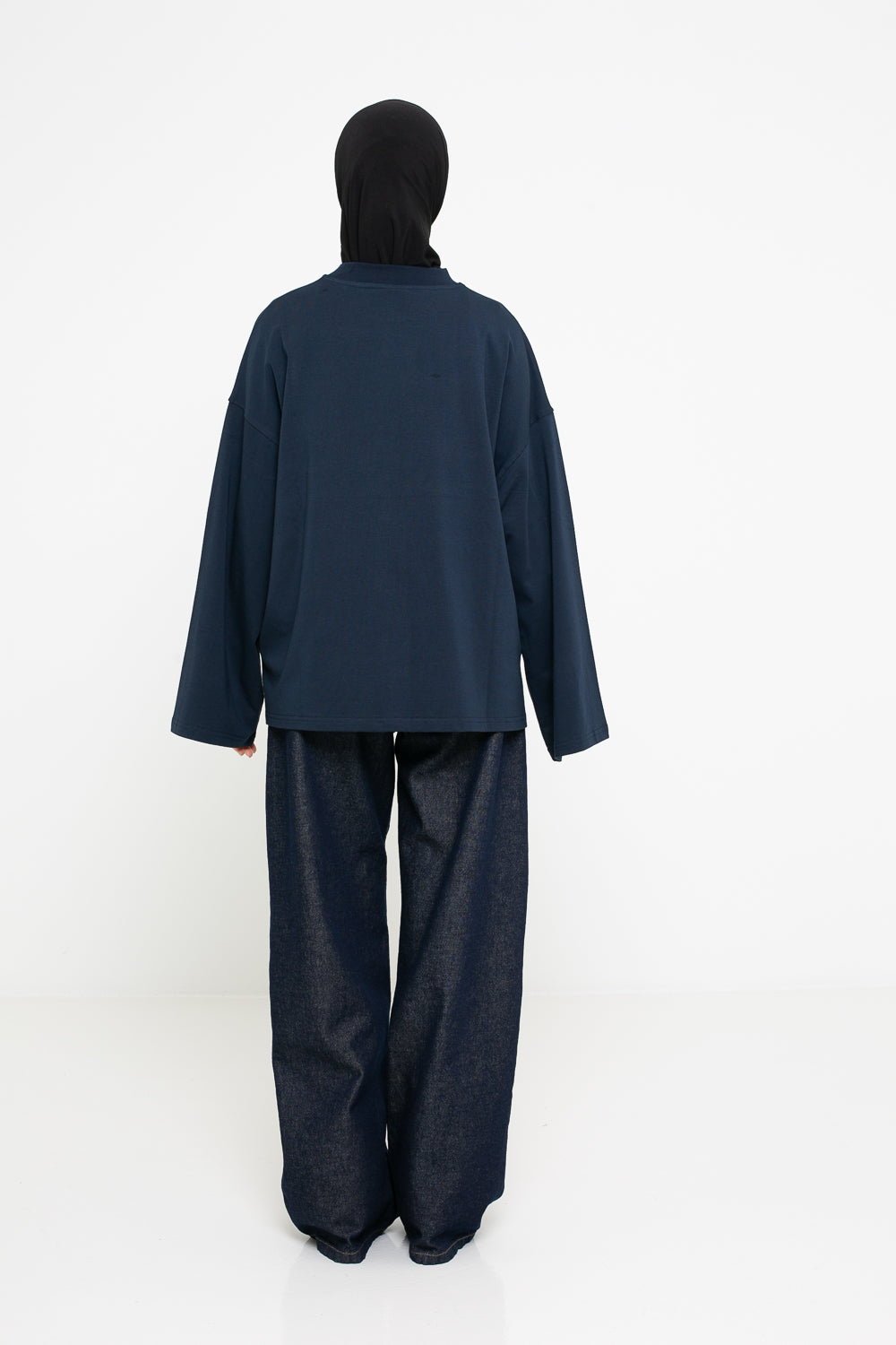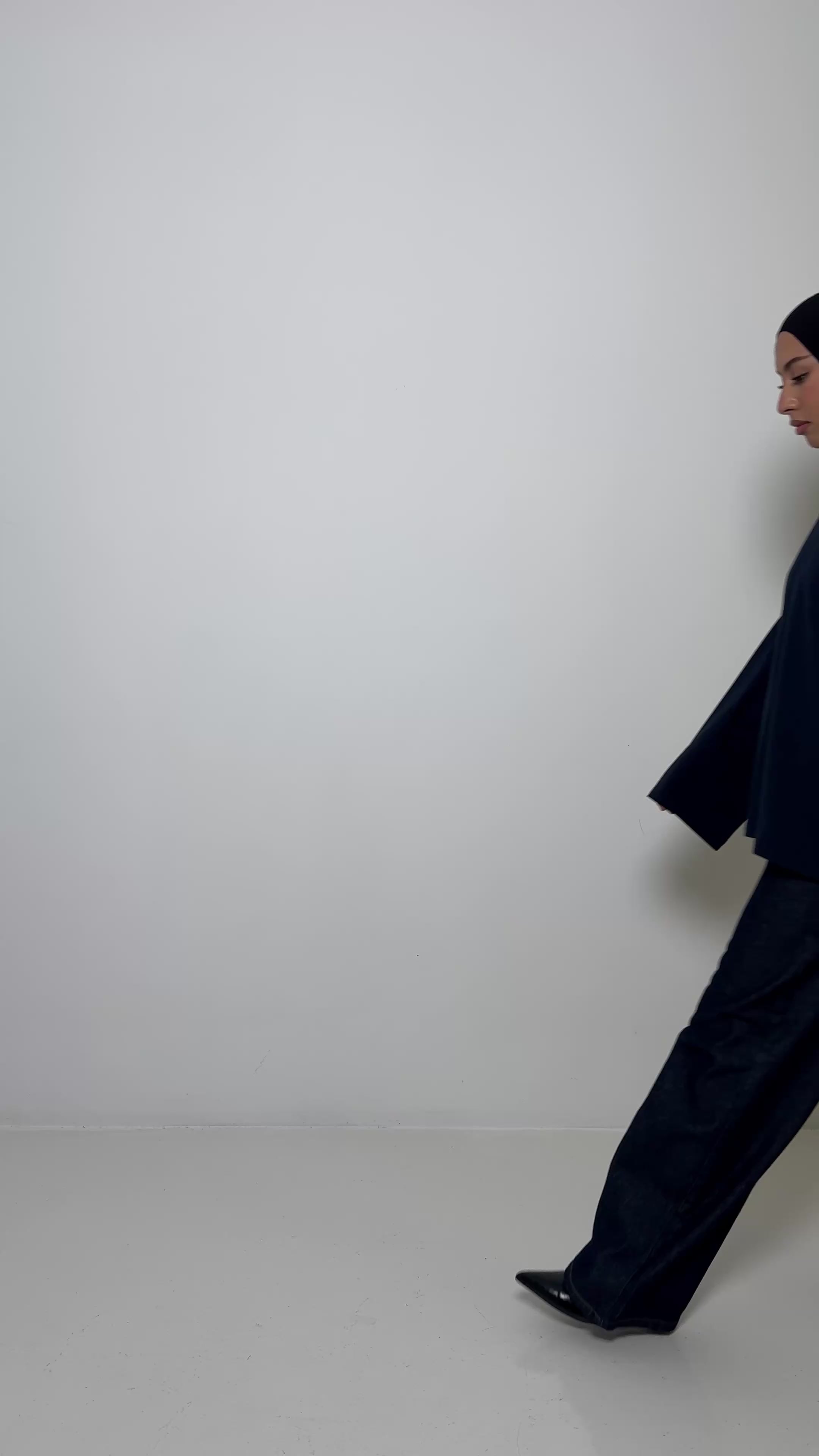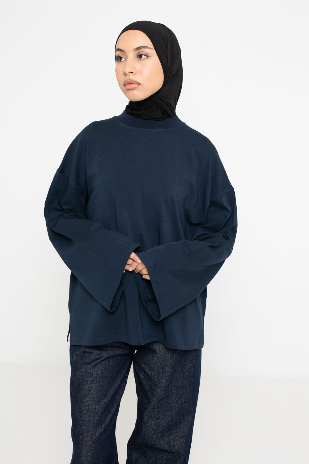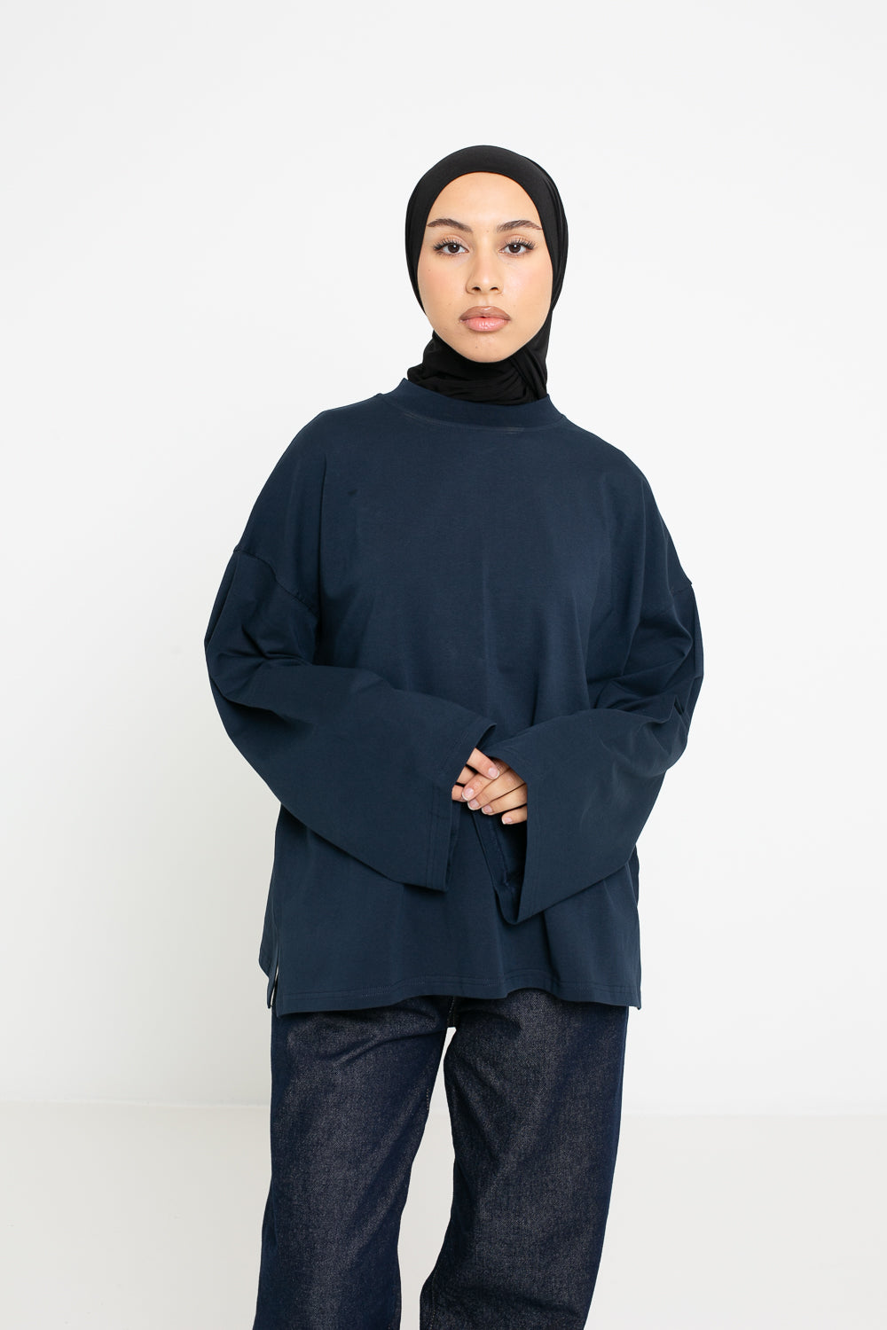 Coupe oversize, manches longues larges, fentes sur le côté et col rond haut pour une couvrance modeste.