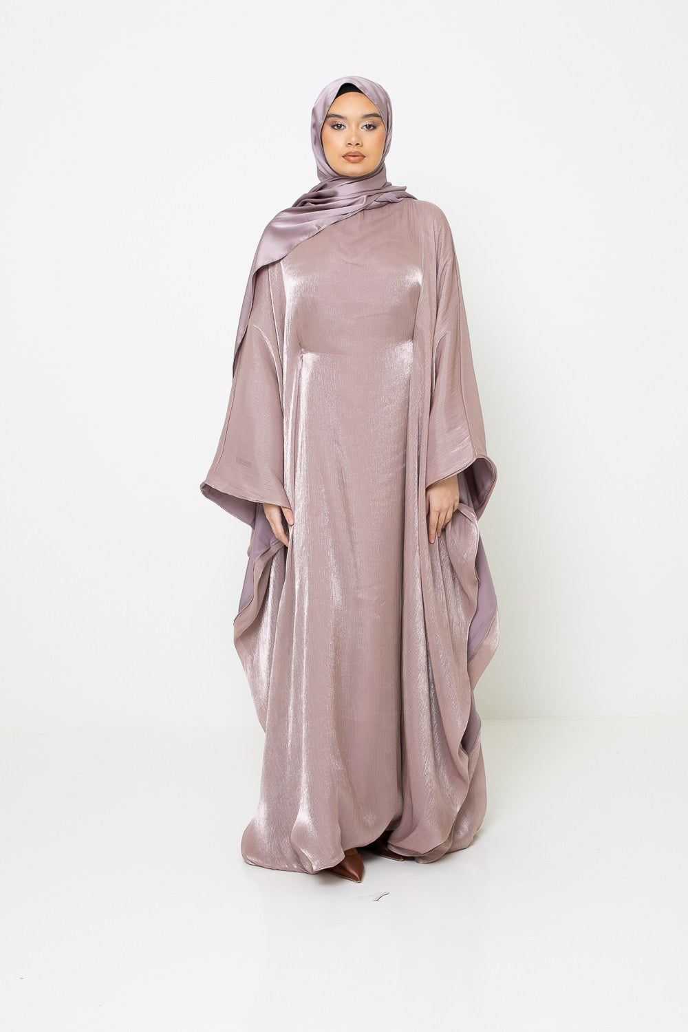 Le hijab en soie ambrée, parfaitement assorti, est proposé séparément pour parfaire cet ensemble avec subtilité.