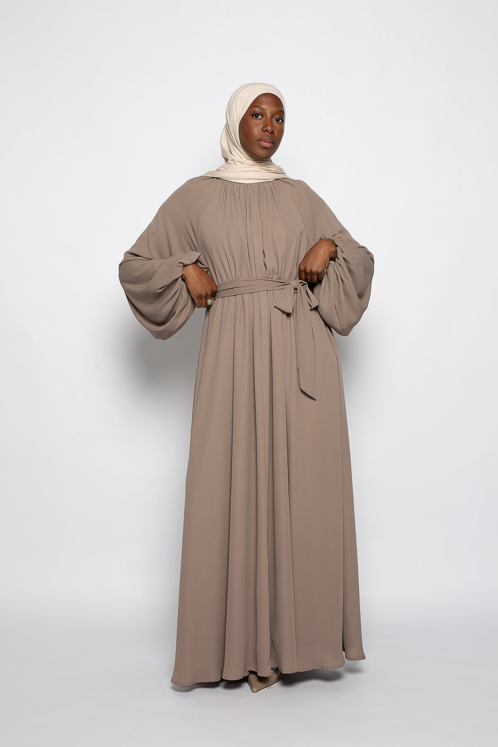 Cette robe longue ample taupe en crêpe de Corée est le fruit d’un véritable travail de création, où chaque détail a été soigneusement étudié pour offrir une pièce élégante, structurée et confortable.