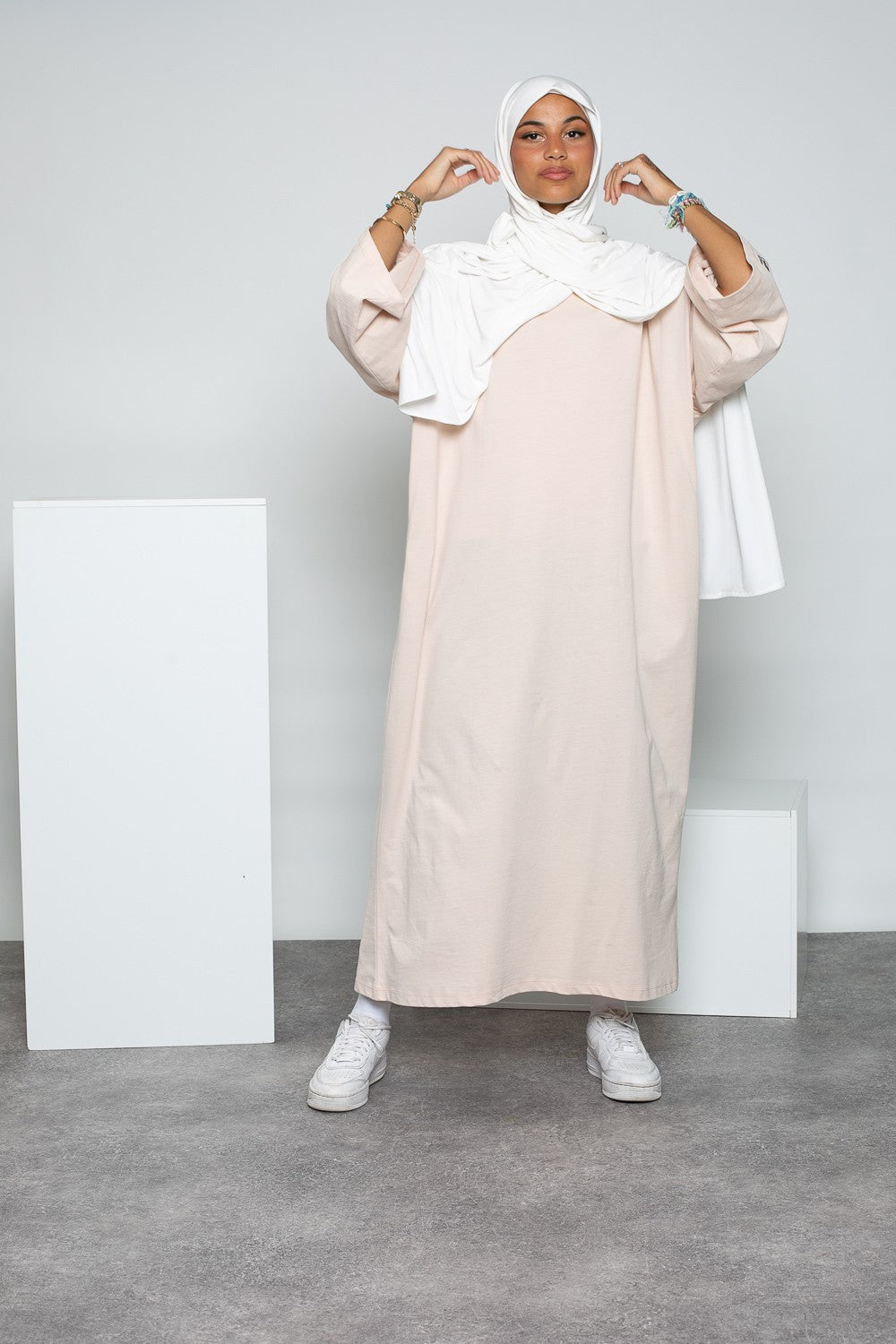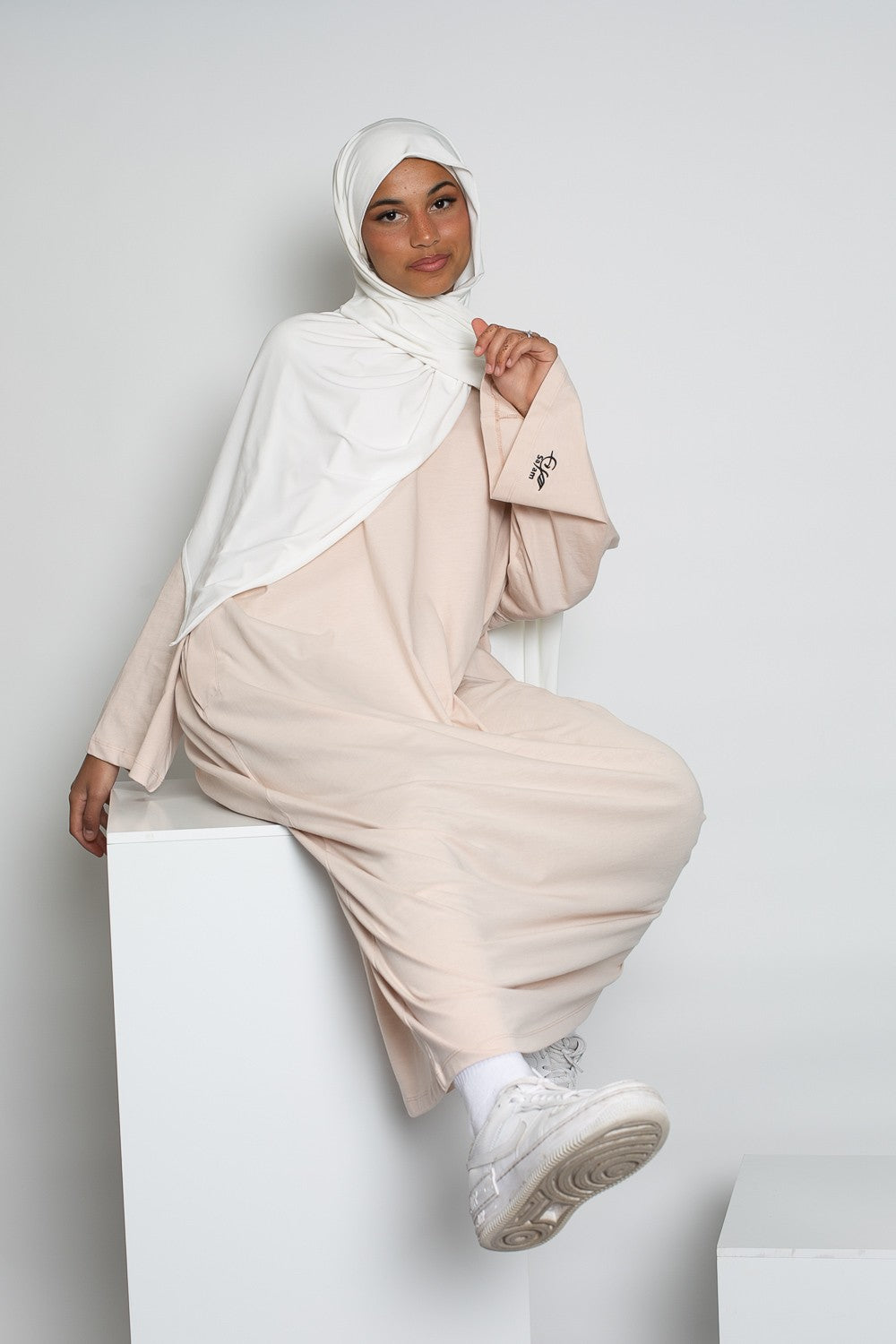 Pour ce outfit le modèle porte un hijab premium sandy jersey et une paire de basket.