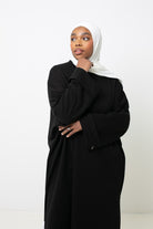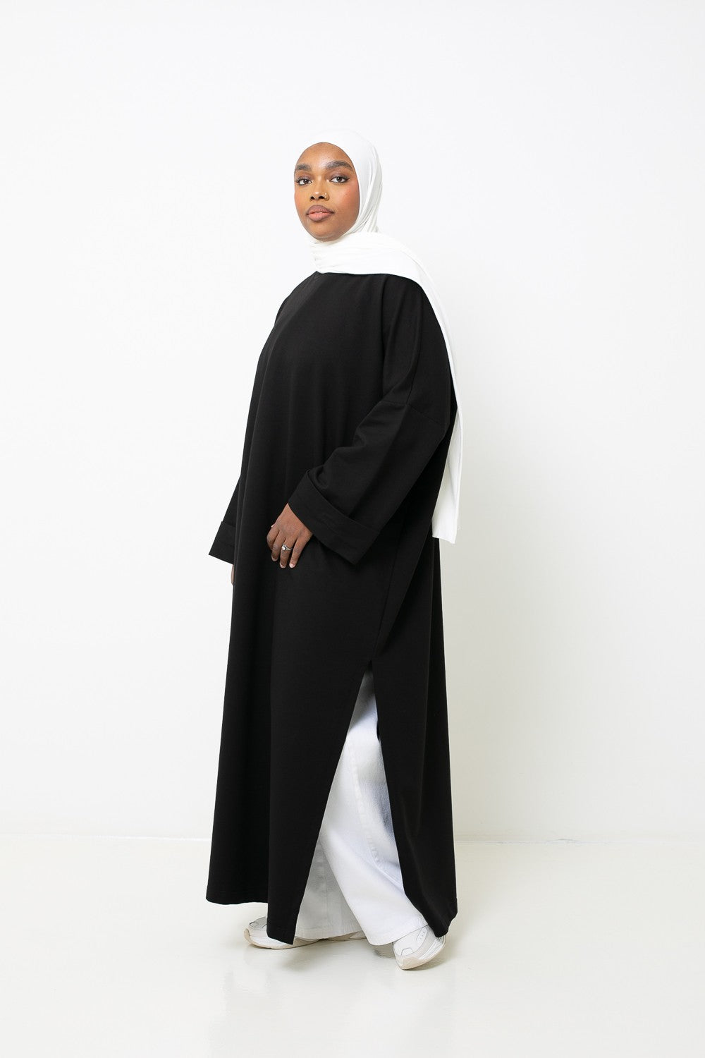 Nous l'avons portée avec un jean loose Salam gris, le hijab jersey luxe soft prêt à nouer gris chiné et des sneakers pour un look effortless.