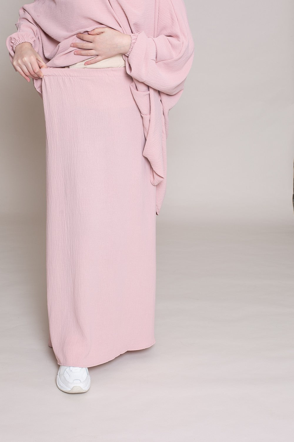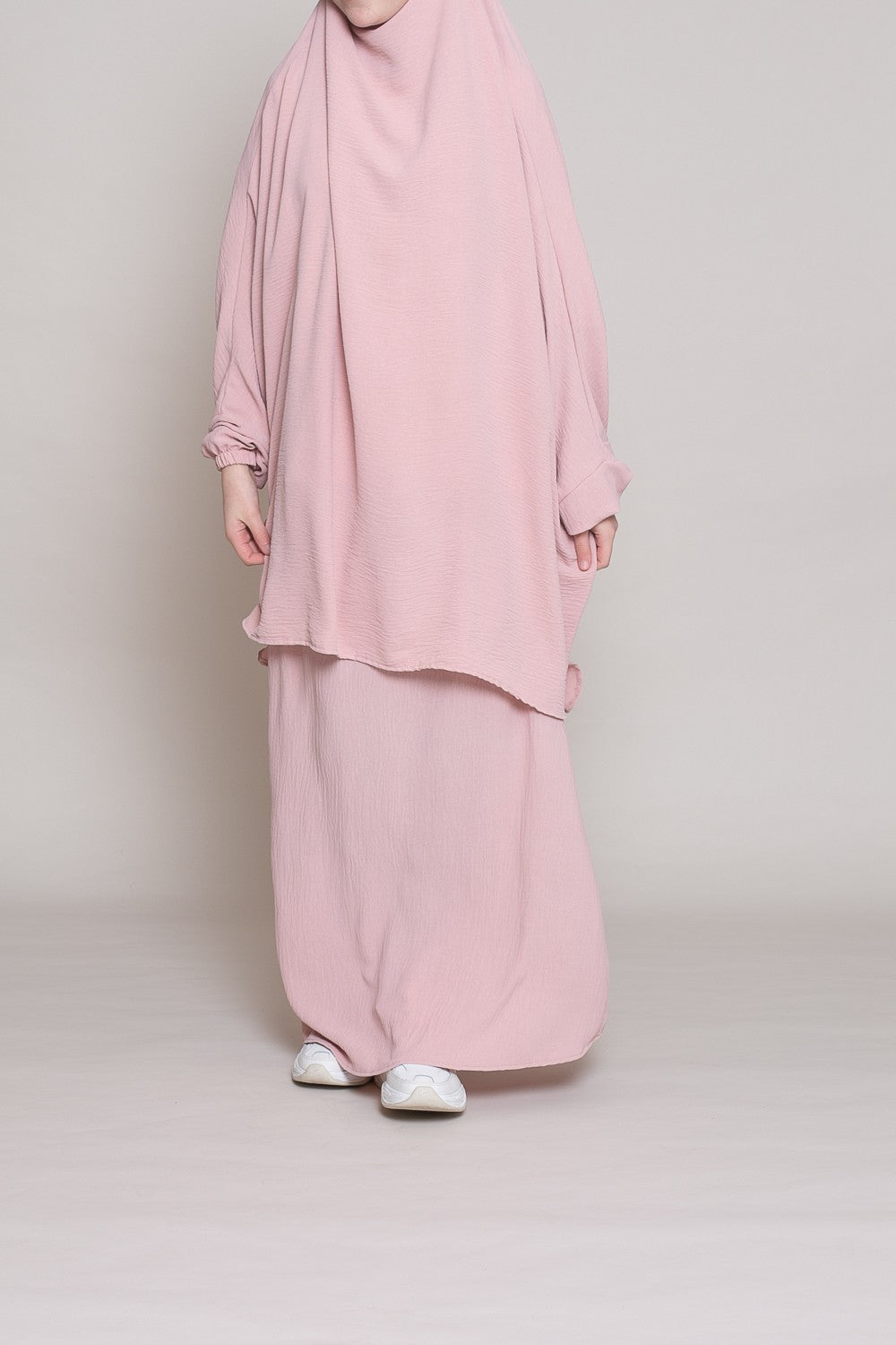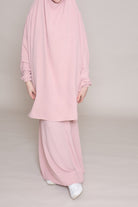 Jilbab deux pièces jupe et haut. Conçut dans un tissu jazz idéal pour toutes les saisons et qui ne se froisse quasiment pas. La jupe longue à taille élastique est large. Le haut est à nouer et épouse parfaitement toutes les formes de visage. Manchette élastique pratique pour les ablutions.
