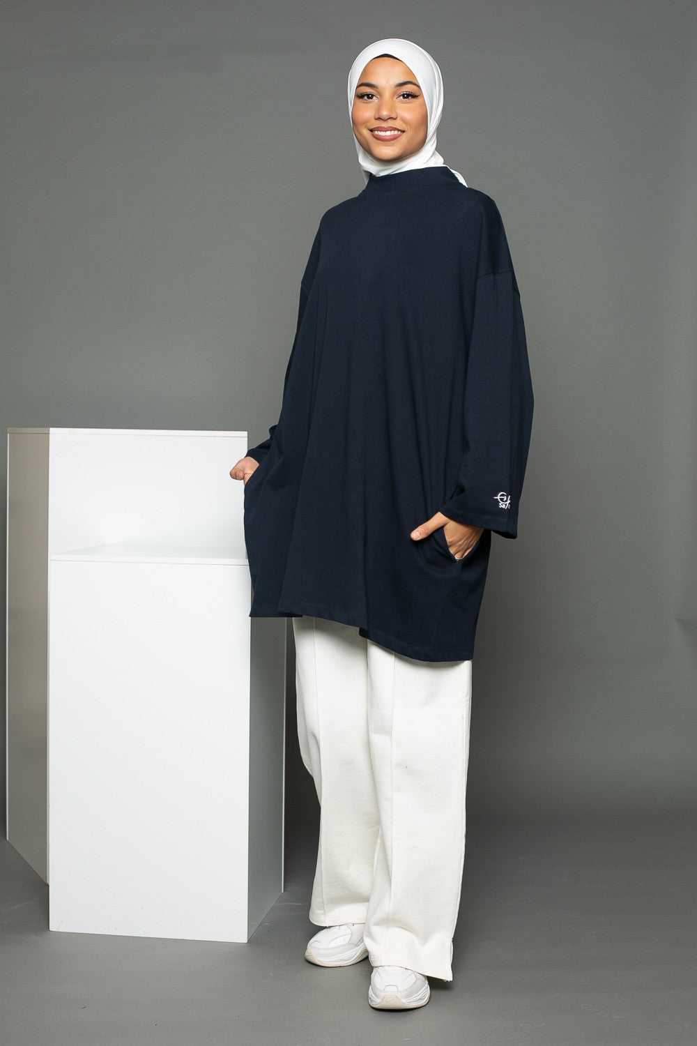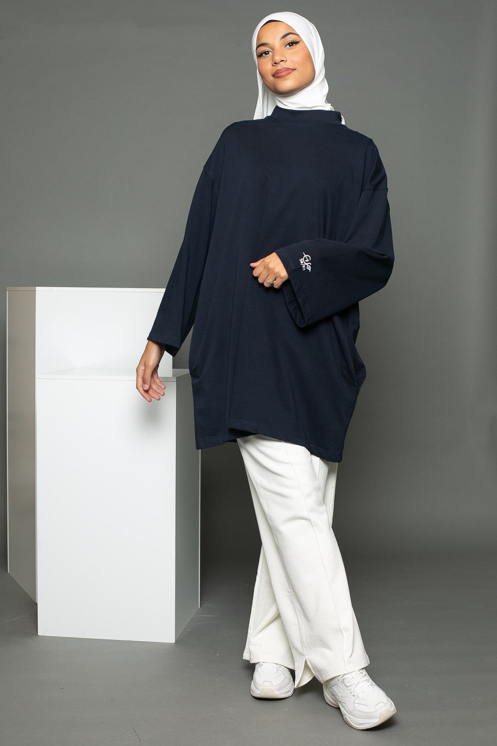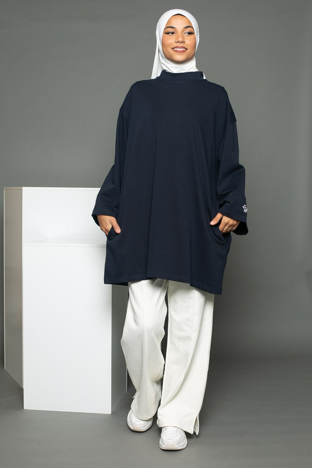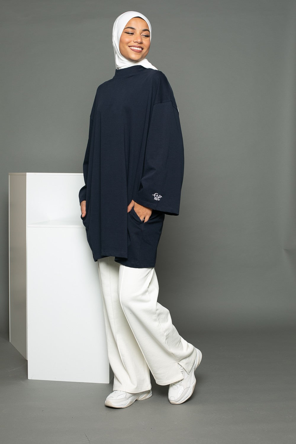Pour cet outfit nous avons porté le pantalon jogging large blanc cassé de la marque Salam, un hijab prémium sandy blanc cassé et une paire de basket. Vous pouvez également porter le tee shirt oversize avec un jeans large et des basket crème.