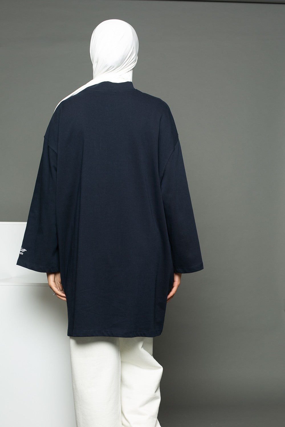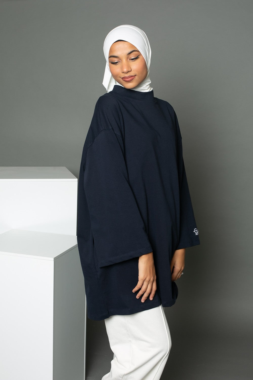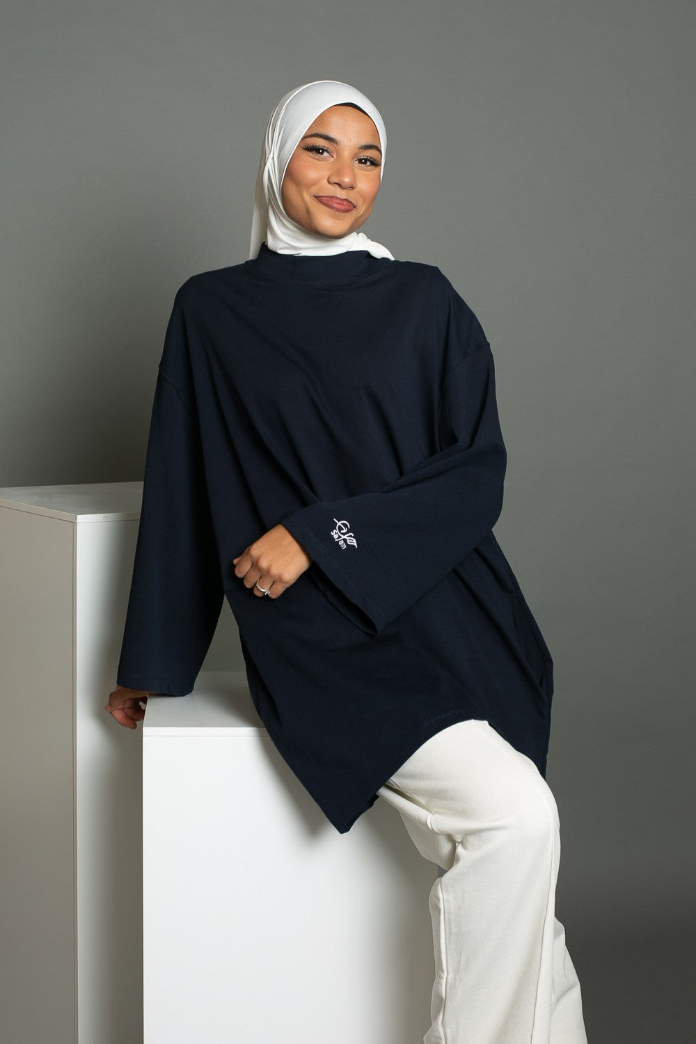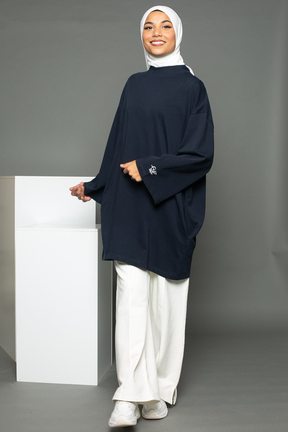 Pour cet outfit nous avons porté le pantalon jogging large blanc cassé de la marque Salam, un hijab prémium sandy blanc cassé et une paire de basket. Vous pouvez également porter le tee shirt oversize avec un jeans large et des basket crème.