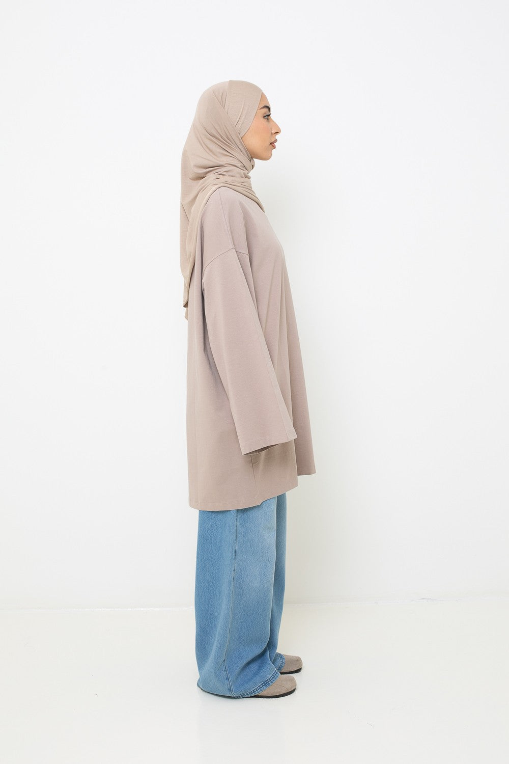 Le modèle mesure 1m64 et porte du S/M pour un 36 habituel. Taille large. Nora porte le jean loose middle blue avec le hijab jersey premium beige taupe.