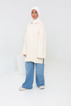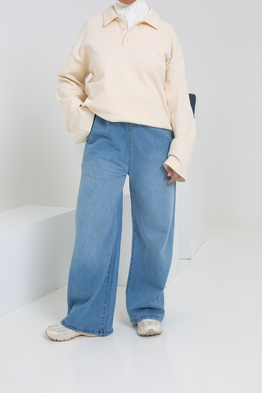 Nous l'avons porté avec le jean loose salam light blue assorti, la cagoule hijab 2 en 1 blanc cassé et des baskets pour un total look streetwear.