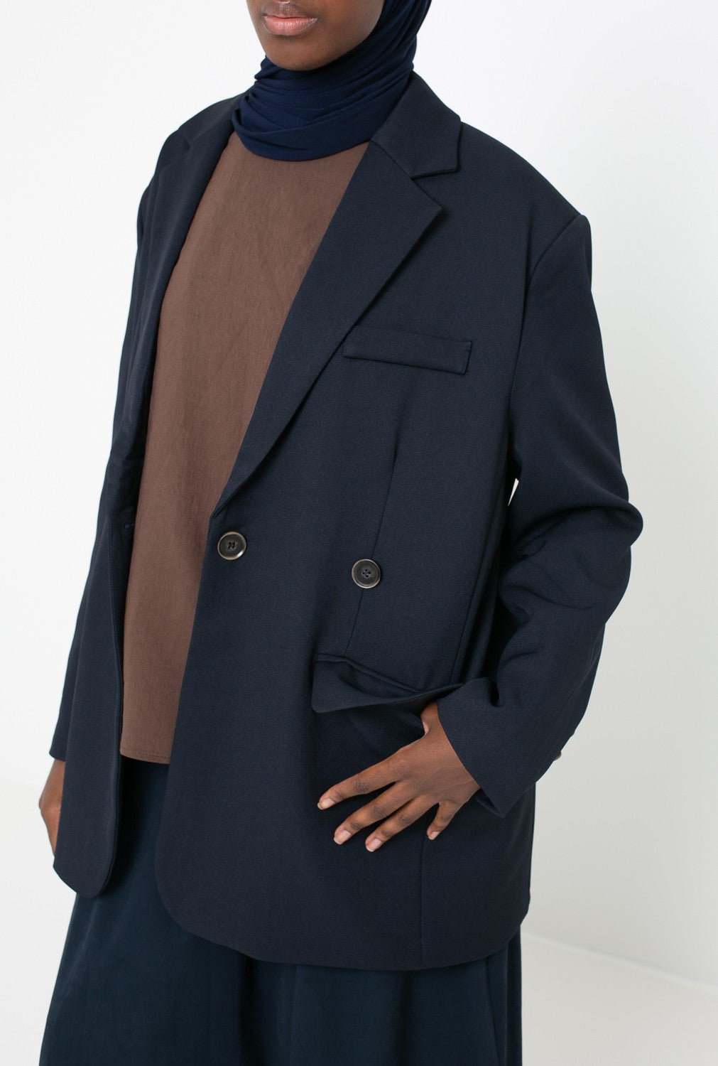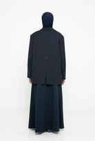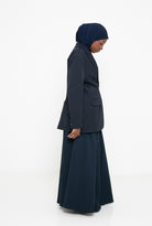 Nous l'avons porté avec notre jupe coton Navy blue et Basic top brown ainsi que le hijab jersey premium bleu foncé une paire de chaussure noir.