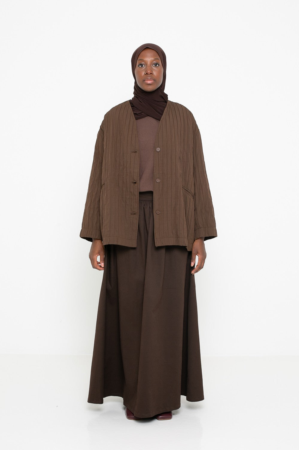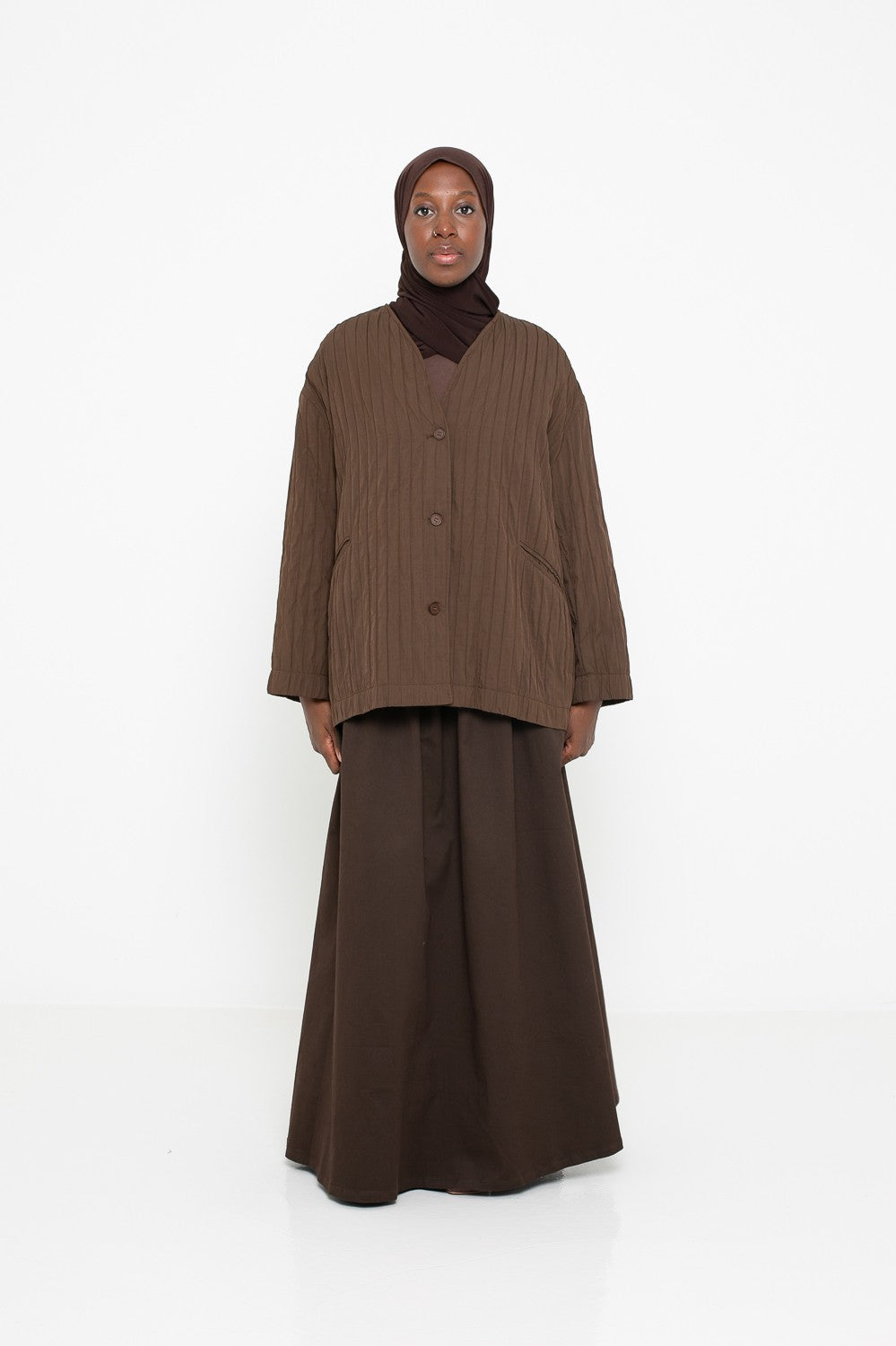 Découvrez notre collection de vestes et manteaux conçus pour sublimer votre style tout en respectant votre pudeur. Que vous recherchiez une veste légère pour la mi-saison, un gilet confortable, un blazer élégant ou un manteau chaud pour l’hiver, vous trouverez ici des pièces adaptées à toutes les occasions. Nos modèles sont pensés pour allier modernité, confort et raffinement, avec des coupes longues et fluides parfaites pour une tenue chic et modeste.