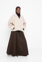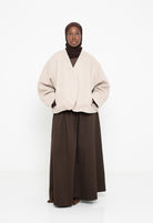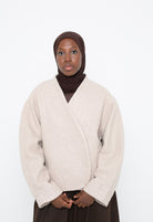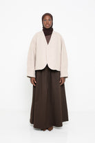 Veste en laine bouclée beige, doublée et élégante. Coupe ballon, col rond. Un essentiel chic et intemporel pour un style modeste et raffiné.