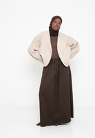 Nous l’avons associée à la jupe coton dark brown, le top basic brown, au hijab jersey premium dark brown et à une paire de chaussures simples.