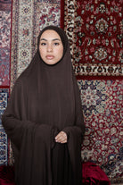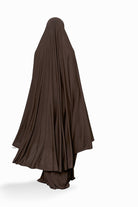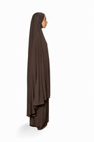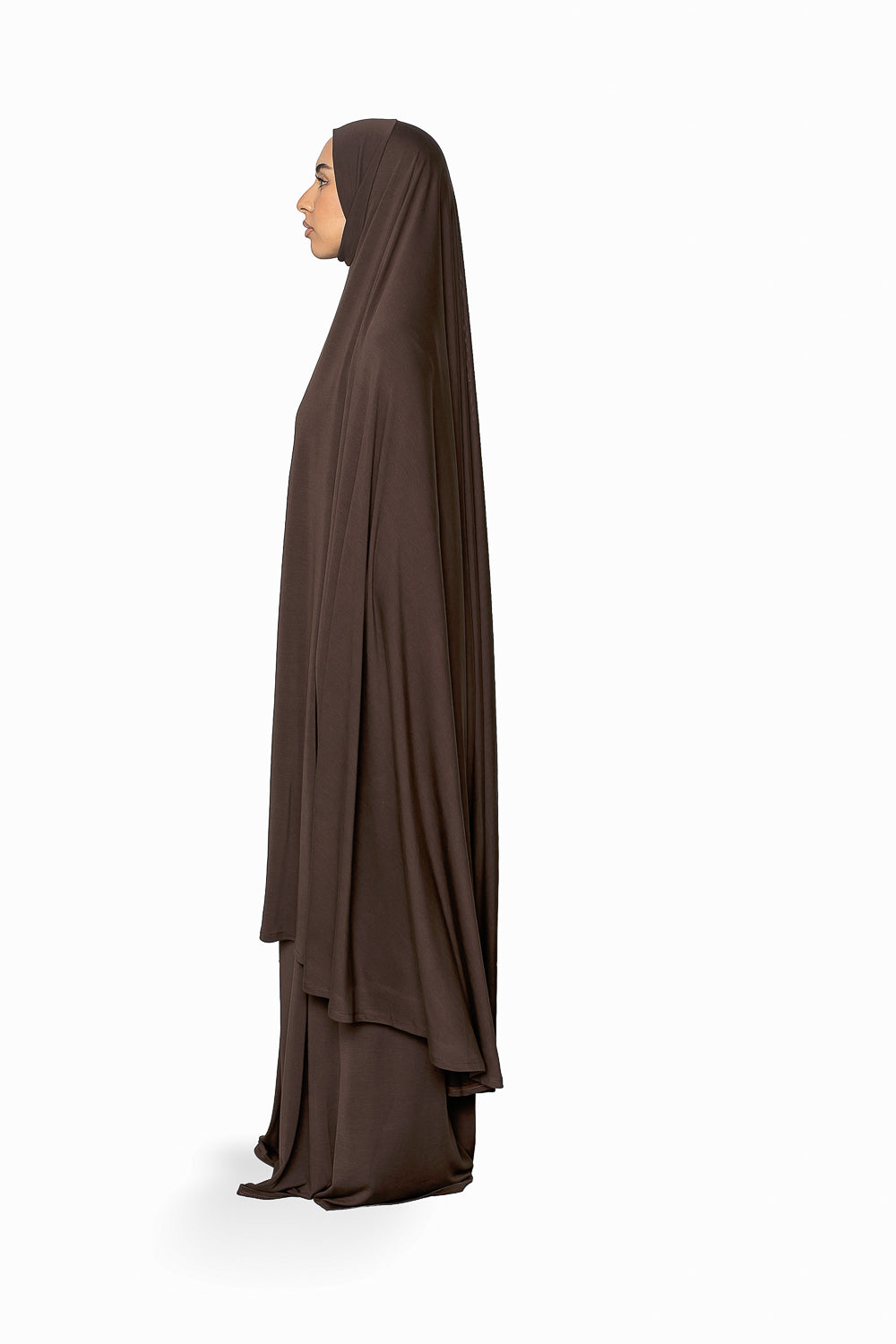 Das Set besteht aus einem langen Rock mit elastischem Bund, der für bequemen Sitz und optimale Bewegungsfreiheit sorgt. Der lange Khimar, der ohne Bindebänder auskommt, lässt sich leicht anziehen und passt sich dank seines leicht dehnbaren Materials jeder Gesichtsform sanft an. Der Kopfumfang kann mithilfe eines Clips angepasst werden, um Löcher zu vermeiden und den Khimar auch für kleinere Köpfe geeignet zu machen.