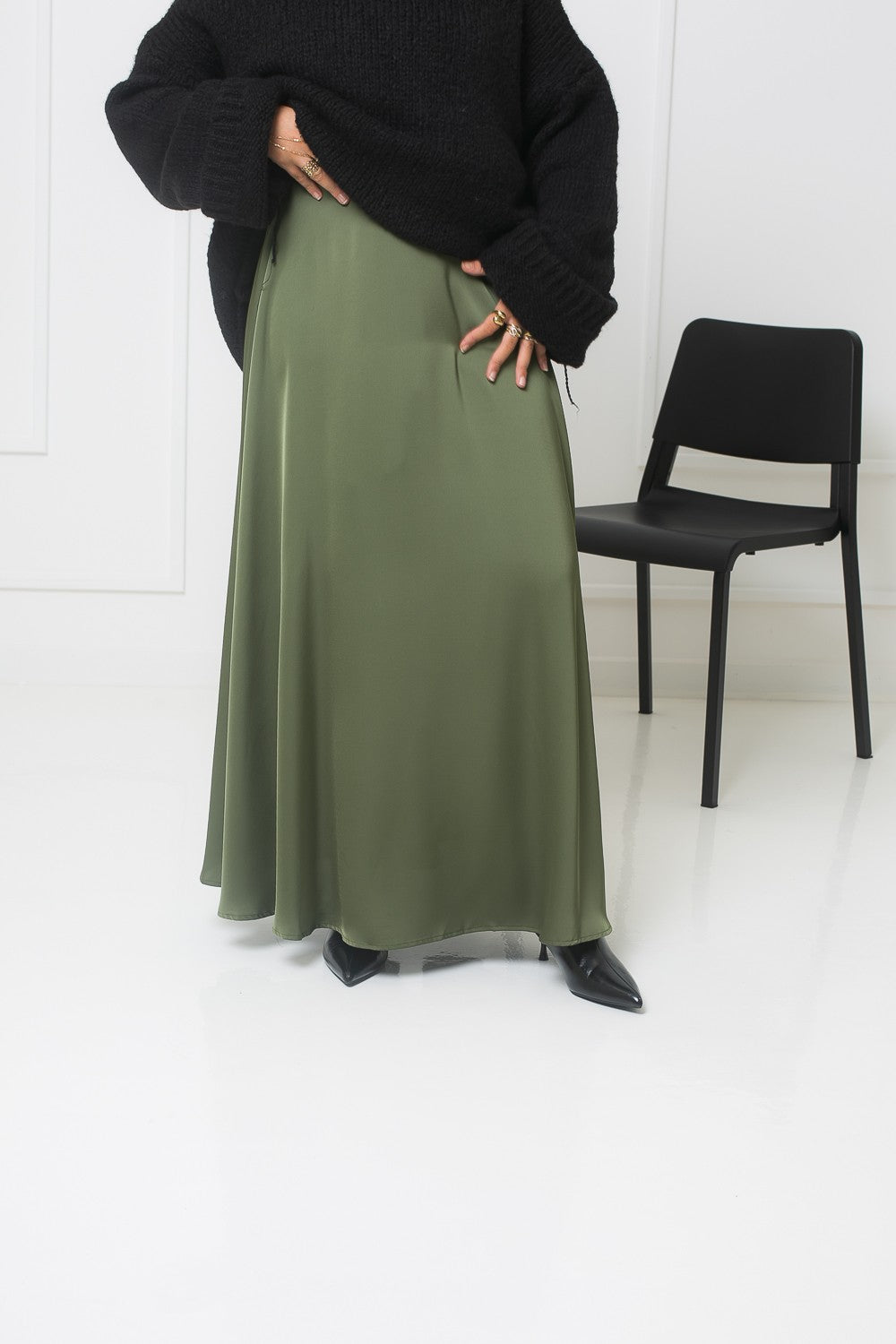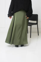 Verleihen Sie Ihrer Garderobe mit diesem langen, ausgestellten Satinrock einen Hauch von Eleganz.