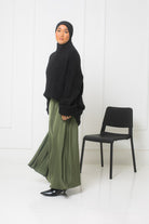 Wir haben uns entschieden, es mit dem schwarzen Grobstrickpullover und dem schwarzen Sandy Premium-Hijab zu tragen.