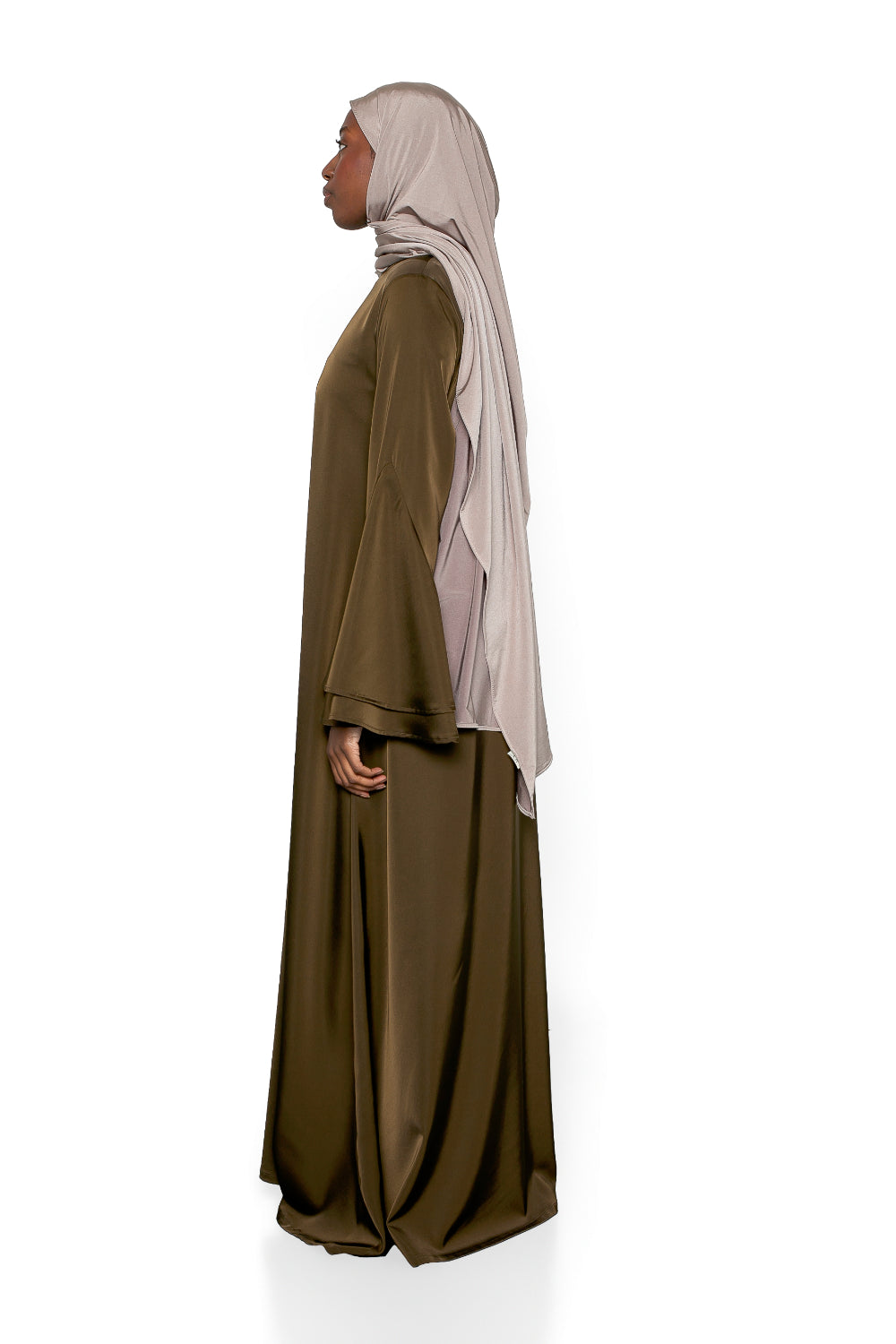 Elegant, fließend und zeitlos – dieses lange Satinkleid mit ausgestellten Ärmeln ist ein raffiniertes Kleidungsstück, das für eine moderne und anspruchsvolle Garderobe entworfen wurde.