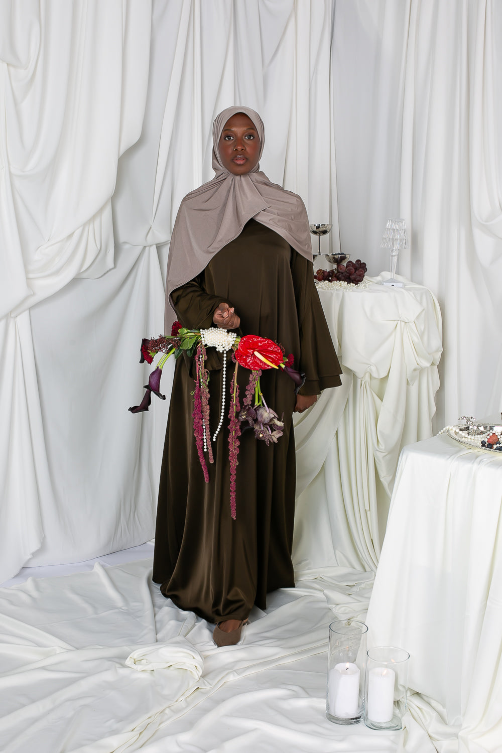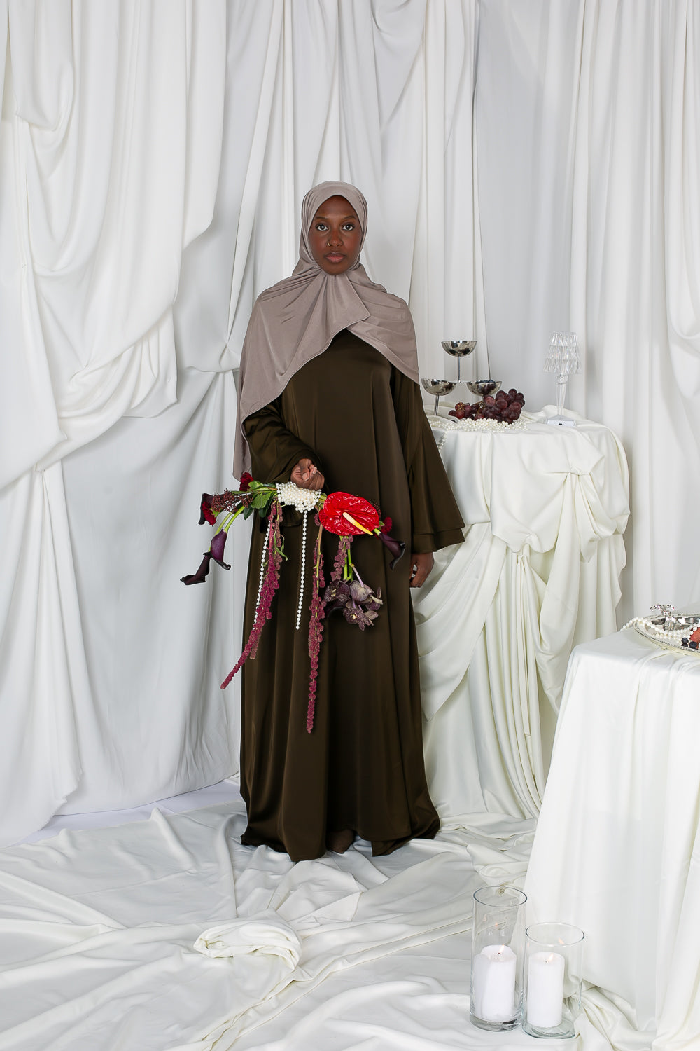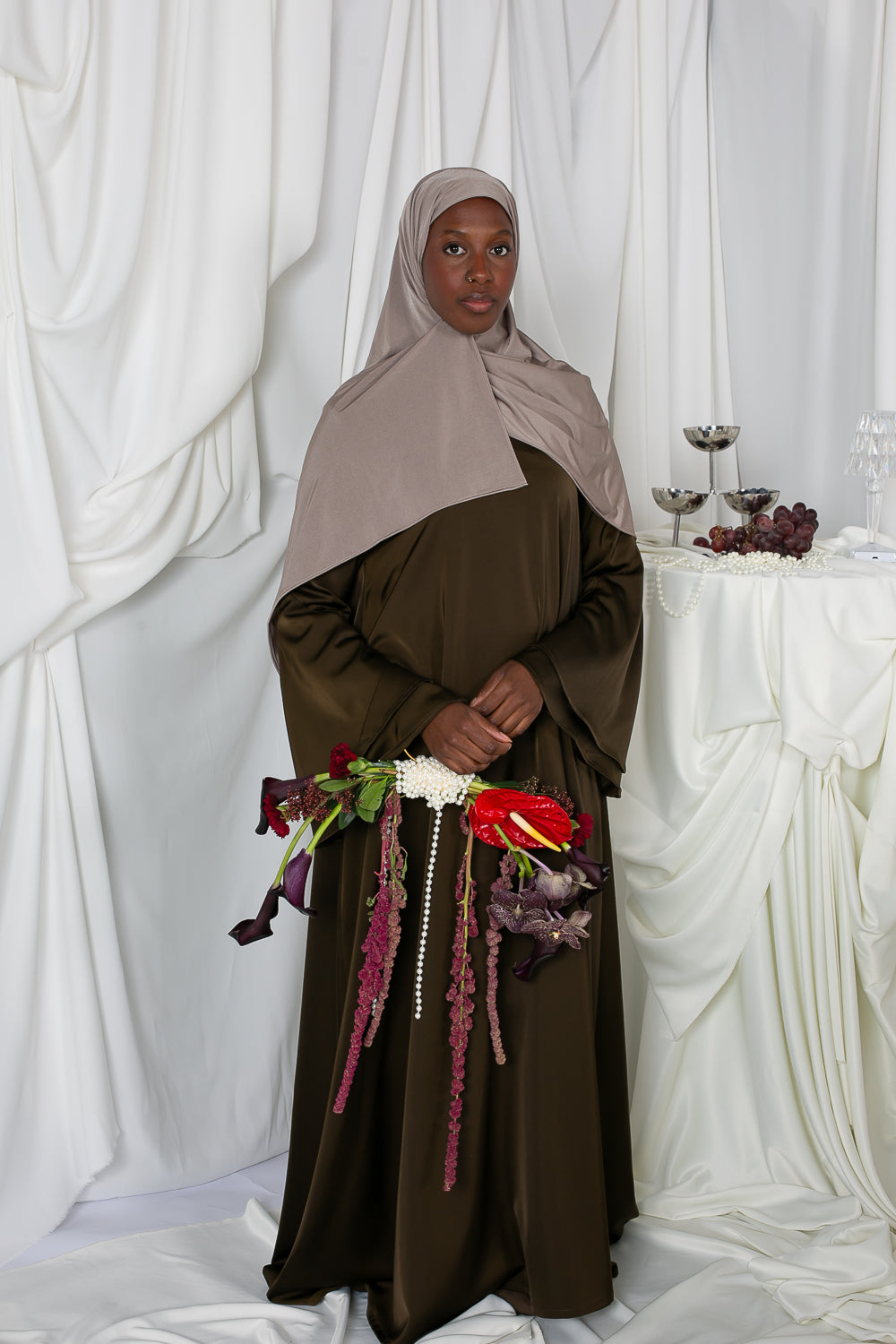 Das Kleid ist am Rock leicht ausgestellt und verleiht jedem Schritt Schwung und Leichtigkeit. Der fließende Satin schmiegt sich sanft an Sie an und kreiert eine elegante Silhouette – ideal für festliche Anlässe, Zeremonien oder besondere Events.
