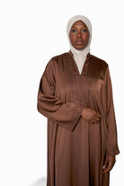 Der V-Ausschnitt wird durch feine Stickereien dezent hervorgehoben, die sich auch an den Ärmeln wiederfinden.