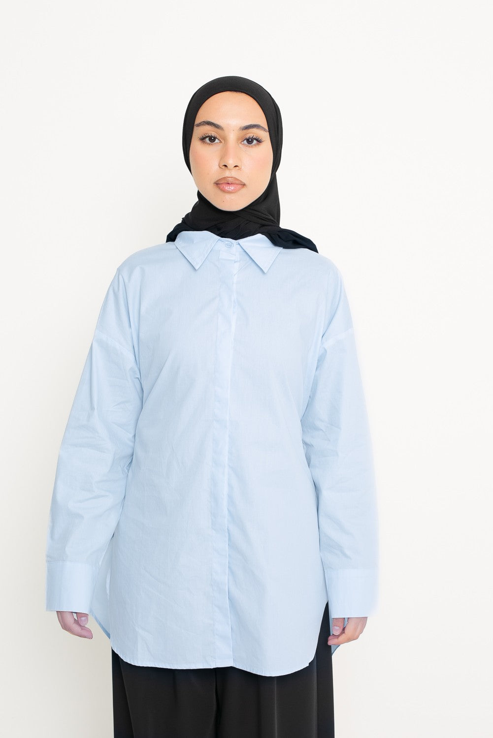 Crafted from a sleek and comfortable fabric, this shirt can be worn for both a formal professional look and a chic everyday look. Paired with flowing pants, a long skirt, or an abaya, it quickly becomes a modern and refined essential in your Chic & Modesty wardrobe.