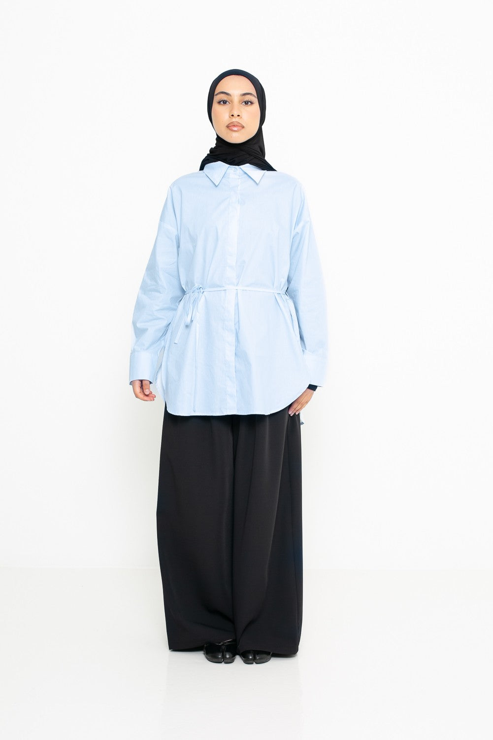Light blue dress shirt with an asymmetrical cut, longer at the front. Featuring a thin tie belt at the back for a sleek, modern silhouette.