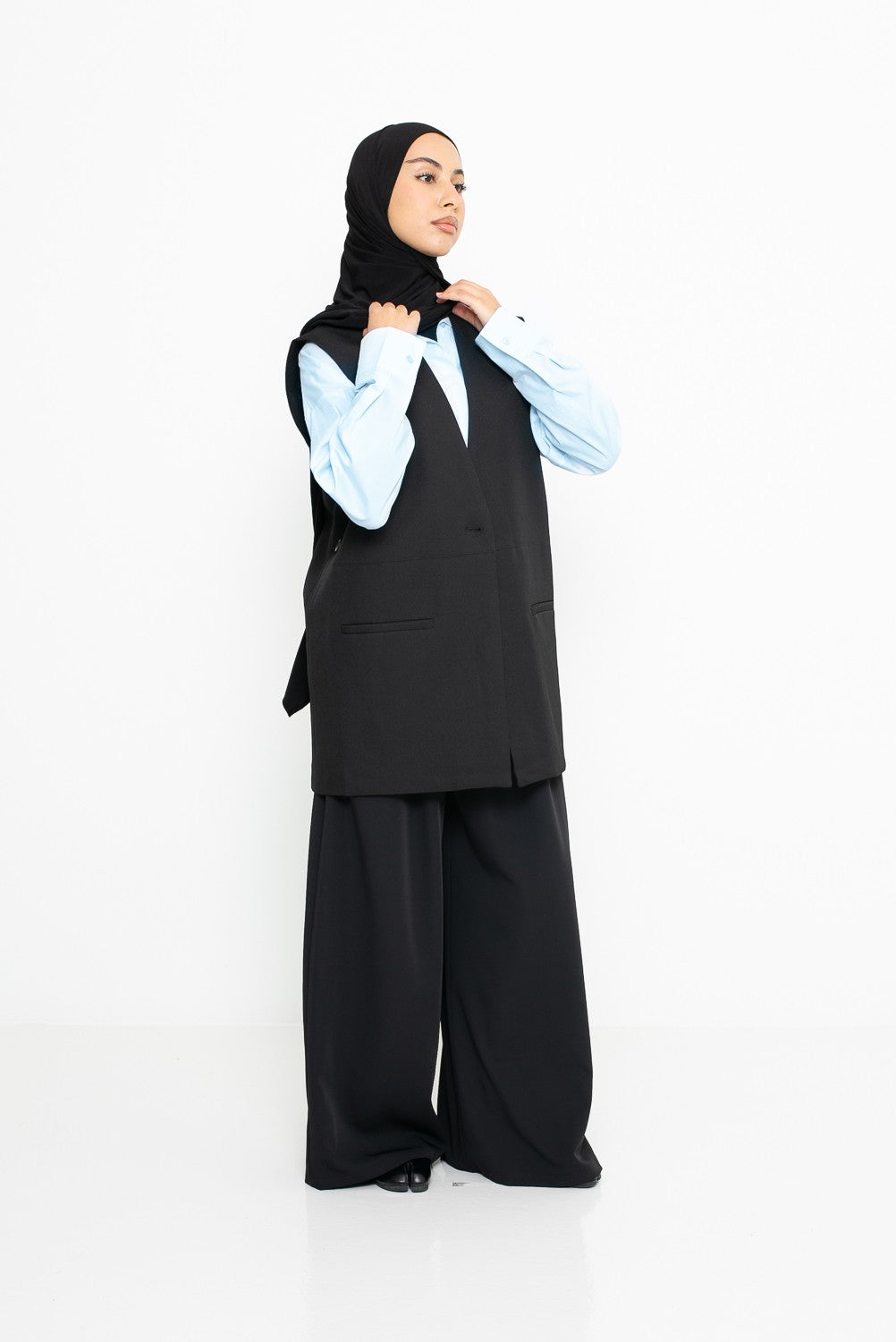 We paired it with black Seoul pants , the black premium jersey hijab, a sleeveless open blazer and a pair of trendy black shoes.